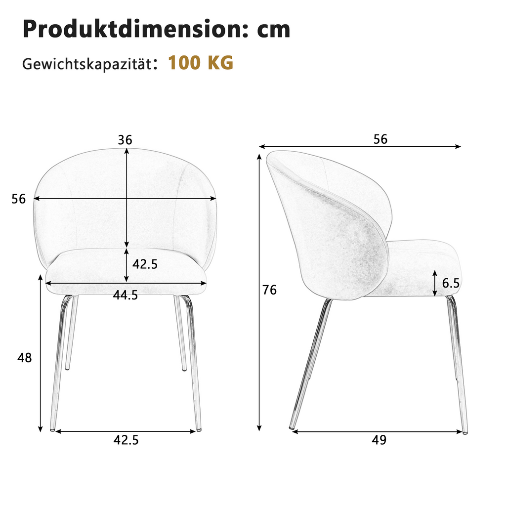 The soft, skin-friendly velvet fabric with a natural sheen provides a luxurious feel and an inviting look. The 6.5 cm thick upholstery offers excellent seating comfort and retains its shape over time. The elegant, gold-plated metal legs with a glossy finish are rust and corrosion resistant, ensuring lasting stability. The reinforced X-shaped metal frame at the bottom provides additional stability and prevents wobbling.