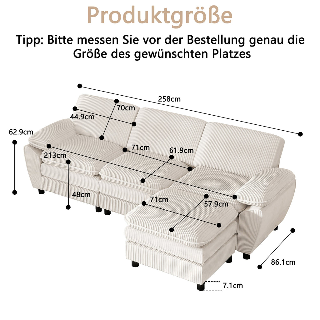 Product Size: Triple Seat (258 cm x 86.1 cm x 62.9 cm), Ottoman Footrest (71 cm x 57.9 cm x 62.9 cm).