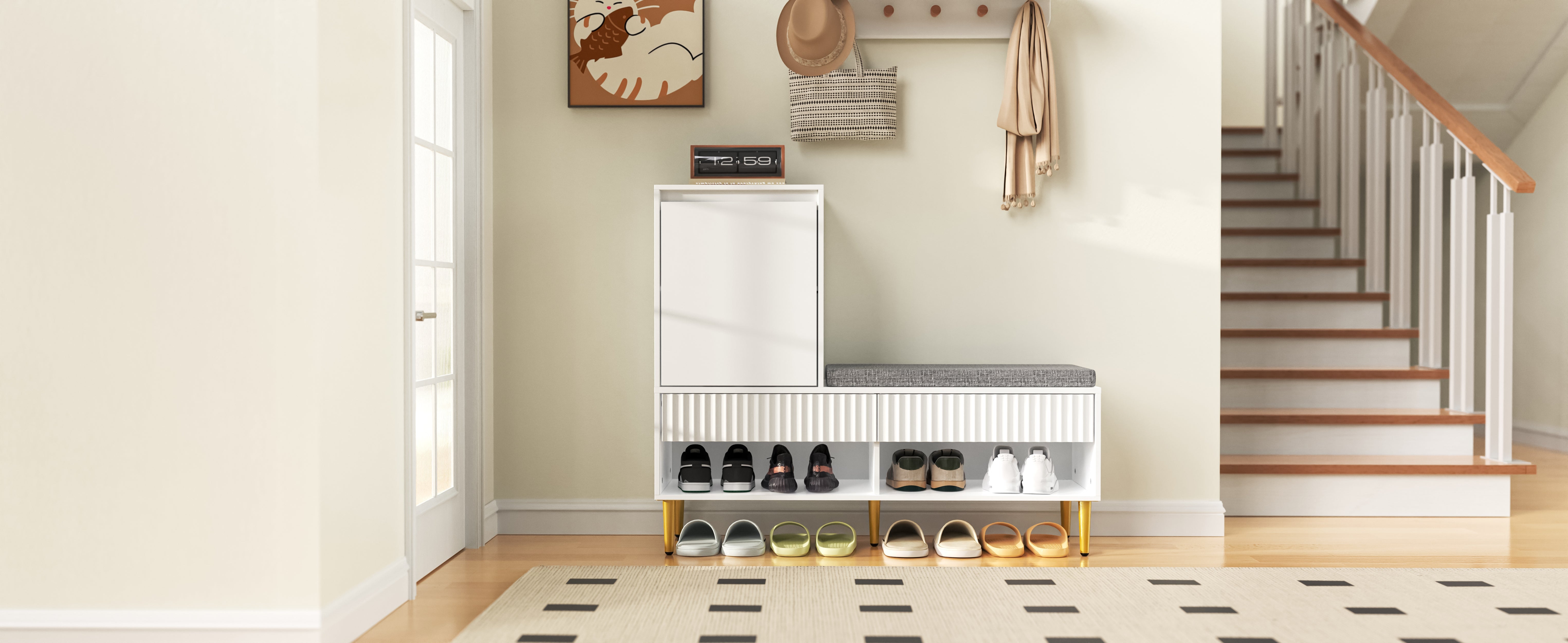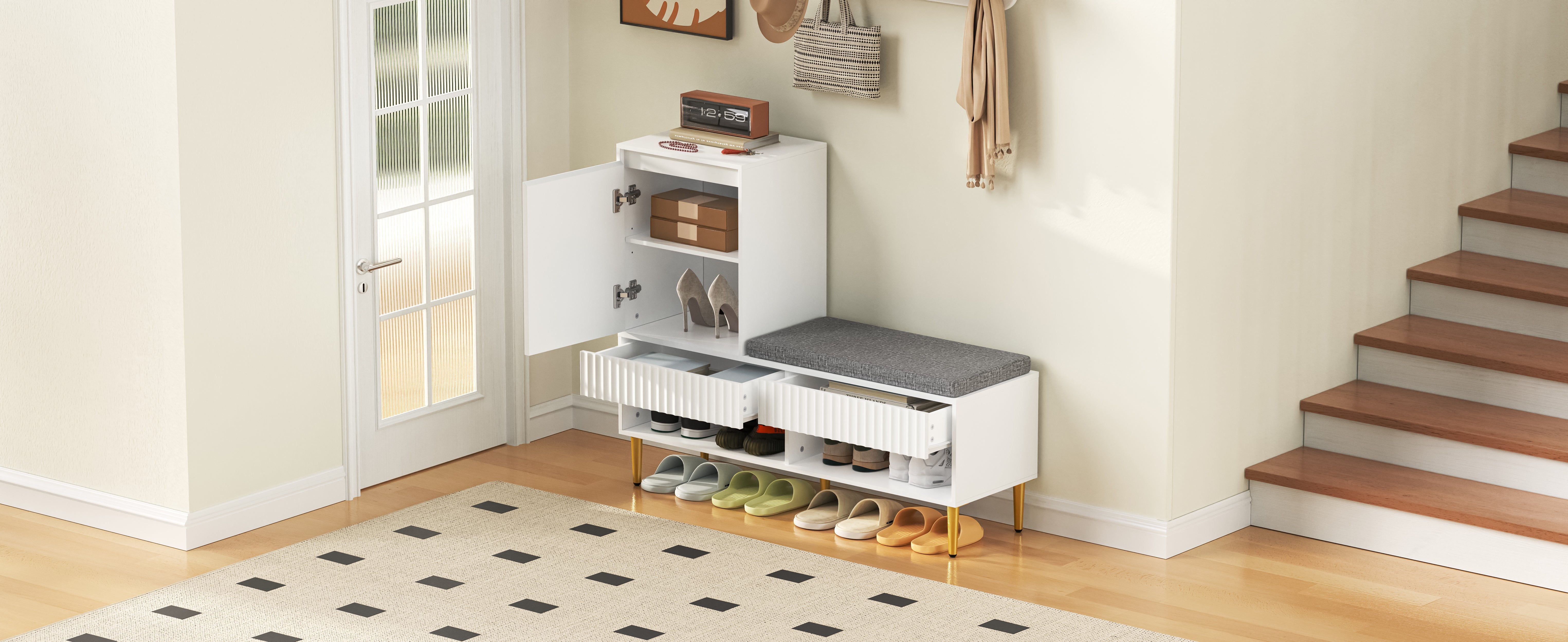 Modern Shoe Cabinet with Bench, 1 Door, 2 Drawers, 2 Shelves, Upholstered; White
