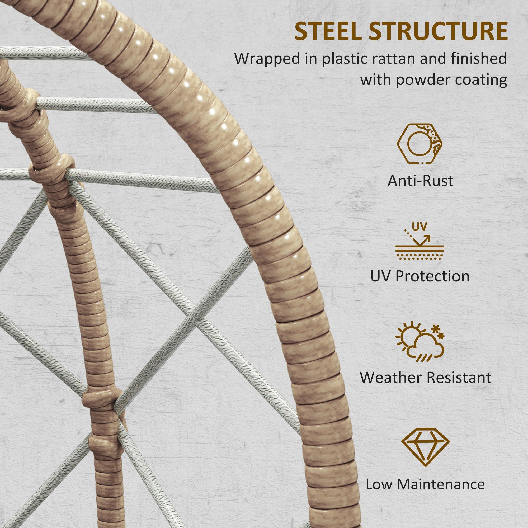 Durable construction: The steel frames are powder coated for a strong core. The hand-woven plastic wicker is stylish and tough, serving as a protective outer layer for this egg garden chair.