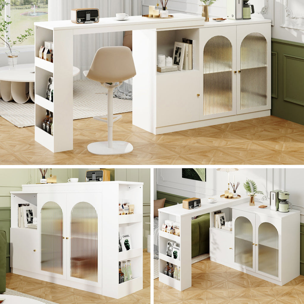 The unique 360° rotatable design of this dining bar cabinet allows it to flexibly adjust its shape to suit your needs, perfectly adapting to different living scenarios and adding more possibilities to your life. In the kitchen, it can be used as a food preparation table for storing cooking utensils and spices, making cooking more convenient. In the restaurant, it can serve as a wine cabinet or tea cabinet, displaying fine wines and glasses, thus creating a relaxing dining atmosphere. In the living room, it can also be used as a bar counter or display case to showcase your beloved collectibles and books, or even become an interactive center for family gatherings. This dining and bar cabinet not only meets the functional needs of various occasions, but also makes space utilization more flexible, offering modern families the perfect combination of versatile functionality and elegant decor.
