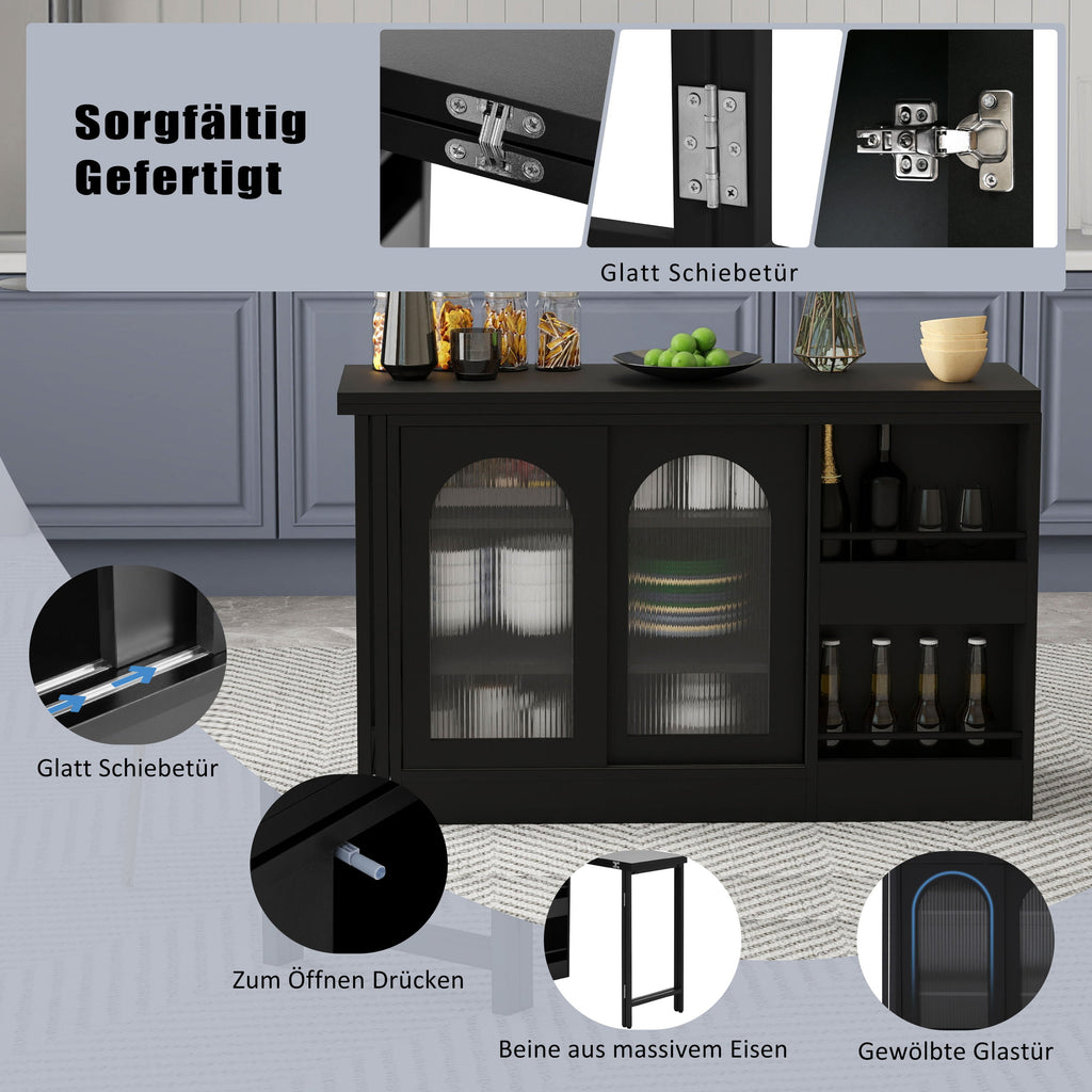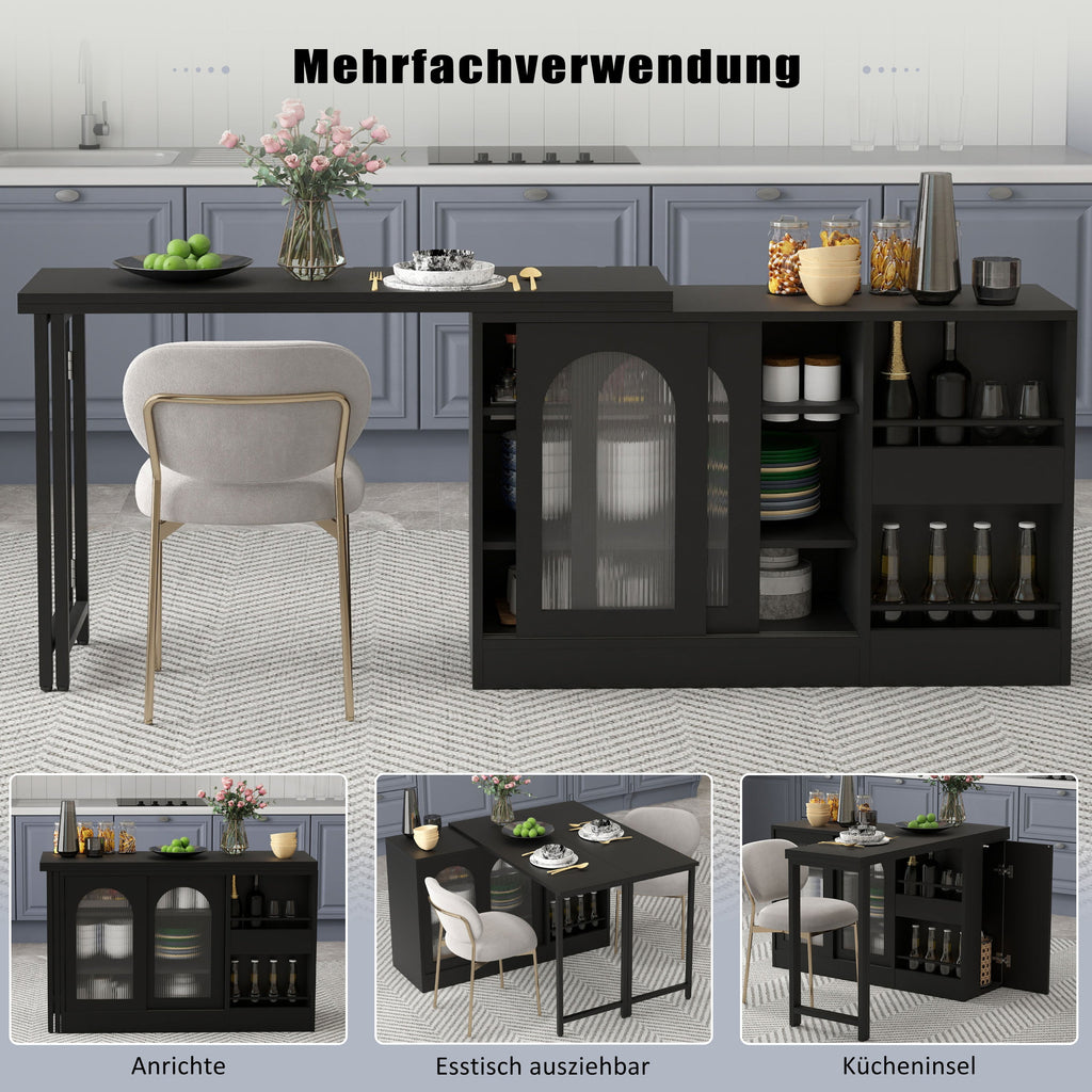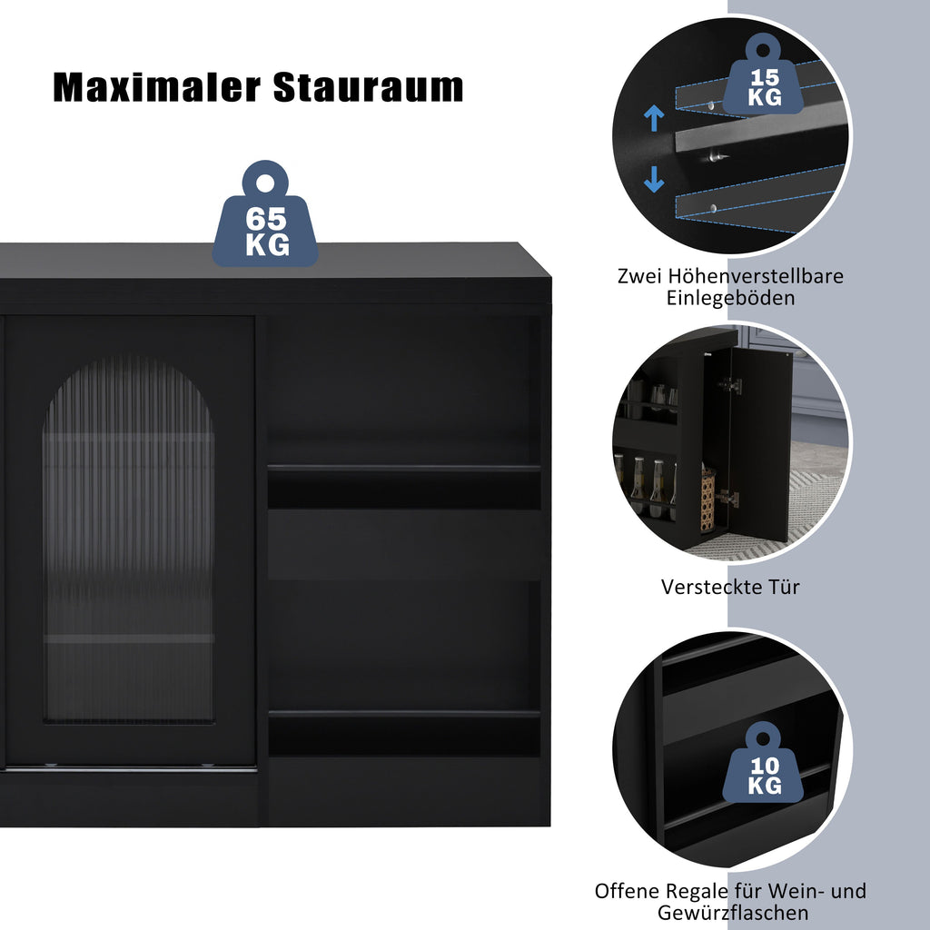 The well-thought-out layout includes a hidden door on the right side with additional storage space for larger kitchen utensils and two height-adjustable shelves. Open shelves on the sides provide space for wine bottles, spices, or other frequently used kitchen accessories, keeping everything within easy reach. The bar table with storage space also offers ample space for your drinks, utensils, and decorations.