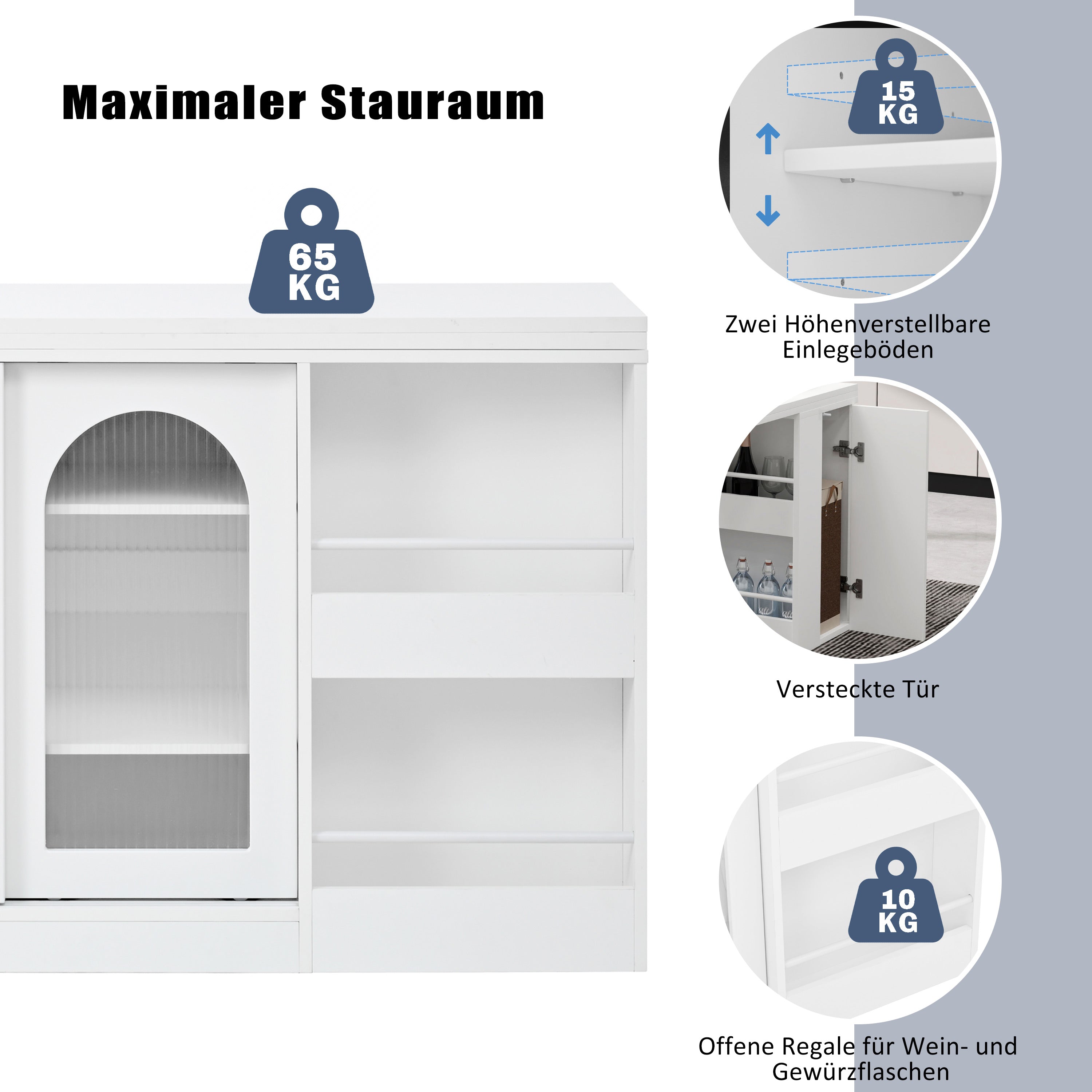 The well-thought-out layout includes a hidden door on the right side with additional storage space for larger kitchen utensils and two height-adjustable shelves. Open shelves on the sides provide space for wine bottles, spices, or other frequently used kitchen accessories, keeping everything within easy reach. The bar table with storage space also offers ample room for your drinks, utensils, and decorations.