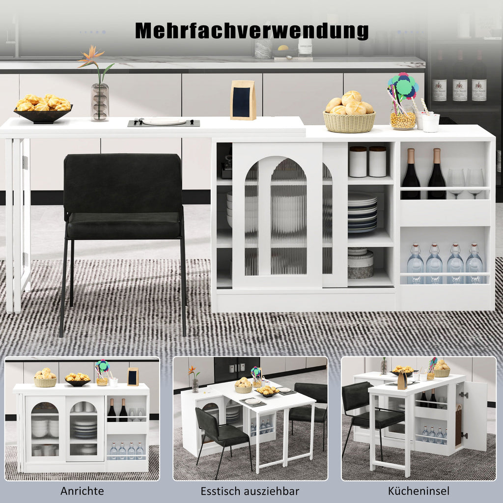 The left side panel can be flexibly rotated 360°, transforming this extendable table into a spacious dining table instantly. Two fold-out tabletops offer space for several people and can be stowed away after use to save space, making it ideal for small spaces or multifunctional use as a kitchen island or bar table.