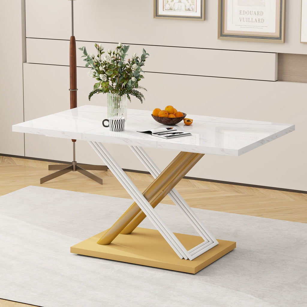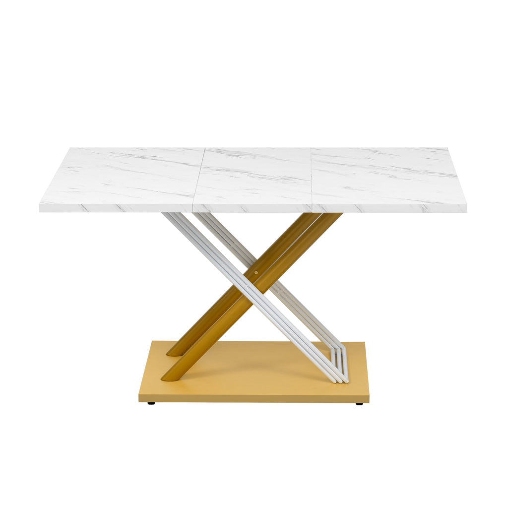 The X-shaped steel legs give the table a three-dimensional look and dynamic elegance. The gold and white color combination of the legs blends perfectly with modern interior styles. The high-quality MDF base provides additional stability, making it ideal as a kitchen table or marble dining table.