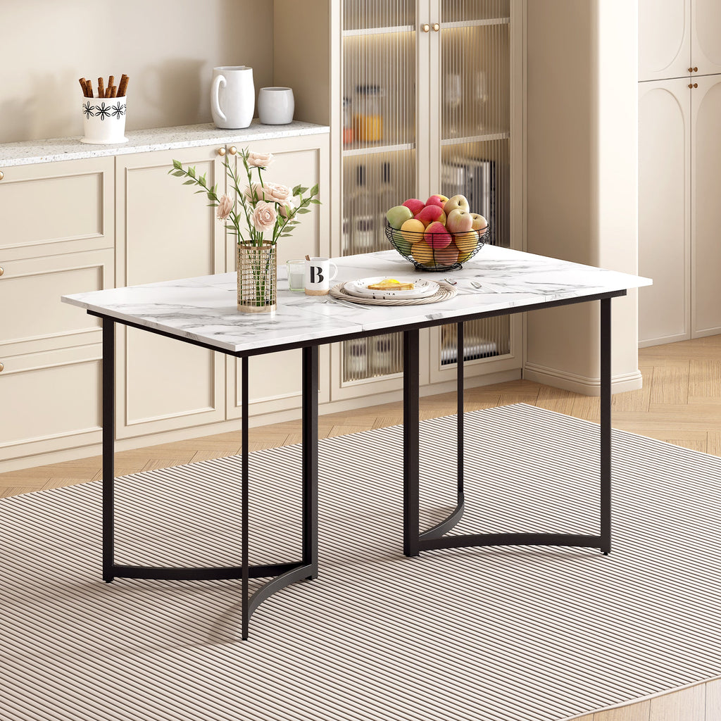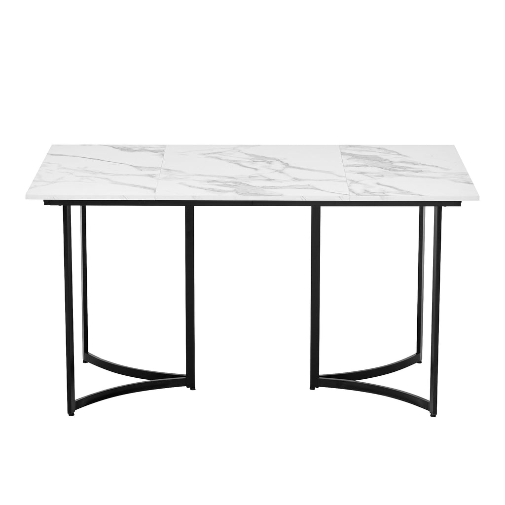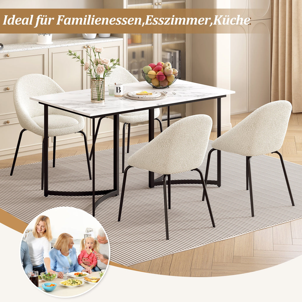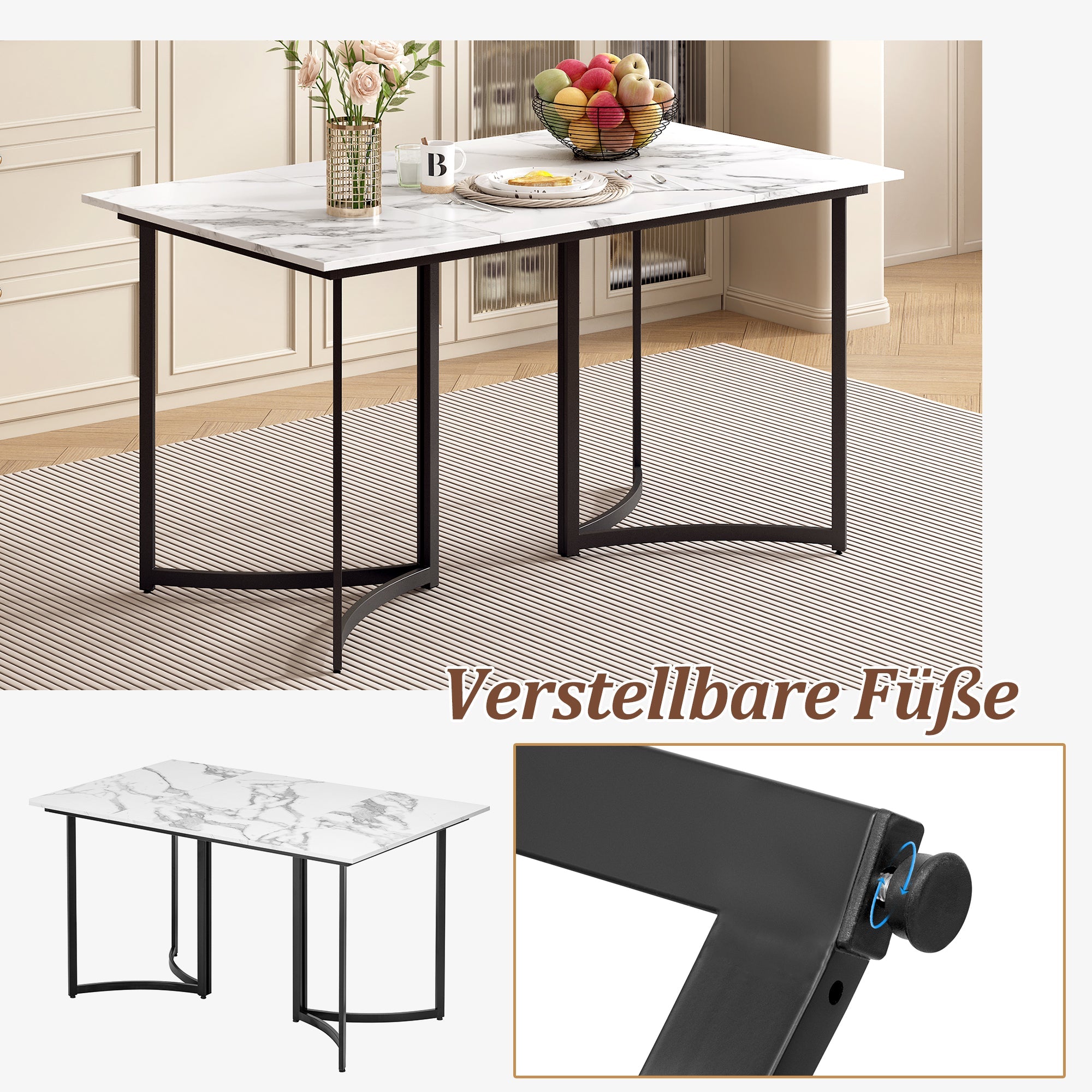 This modern white dining table features a beautiful marble-look tabletop that is smooth, scratch-resistant, and easy to clean, offering a perfect blend of functionality and aesthetics. Ideal for family dinners, its generous tabletop (140 cm x 80 cm) provides ample space for everyone to enjoy meals together. With its contemporary design, this practical and stylish dining table is a perfect addition to any dining room or kitchen.
