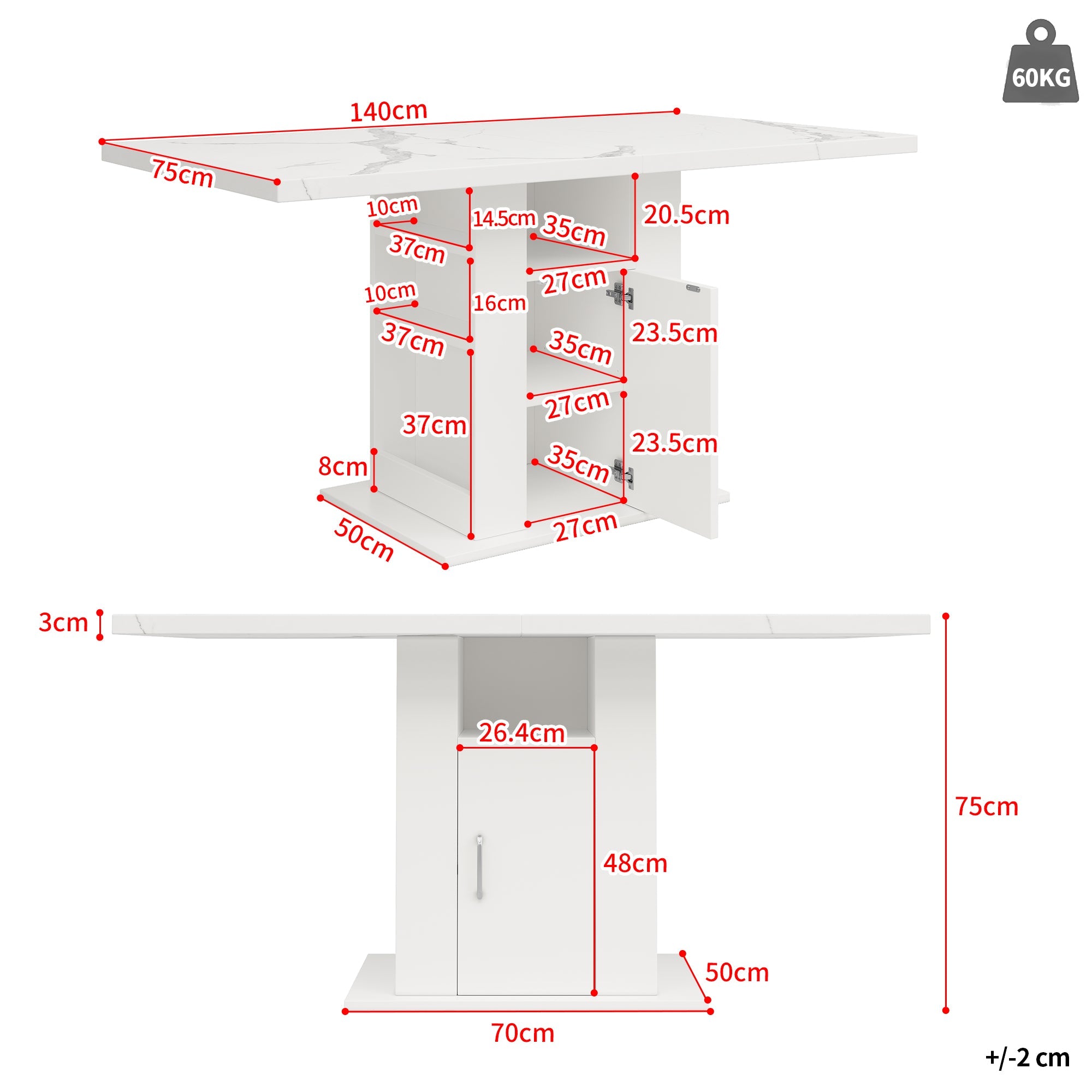 Product Size: 140x75x75cm. Product Weight: 37.7kg/table. Material: MDF. Load-Bearing Capacity: 60kg/table. Assembly Required: 30 minutes. Scope of Delivery: One table, assembled parts. Number of Packages: 2. Country of Origin: China.