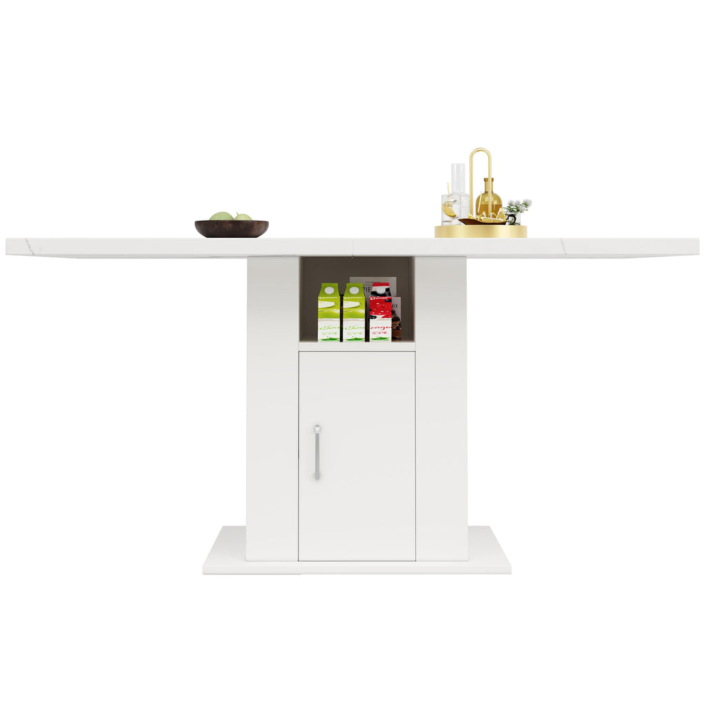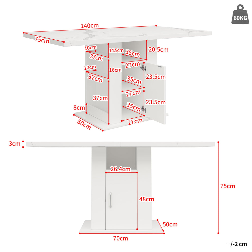 This dining table is crafted from selected high-quality MDF material, ensuring sturdiness and durability. The marble-patterned tabletop features a unique design. The aluminum handle on the storage door is easy to open and creates a modern feel.