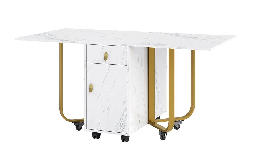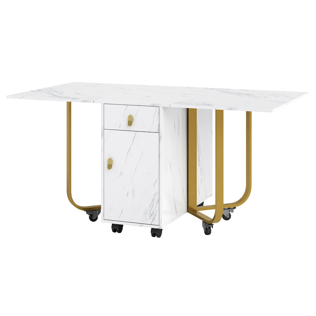 Folding Dining Table, Cabinet & 2 Drawers, Space-Saving, White/Gold