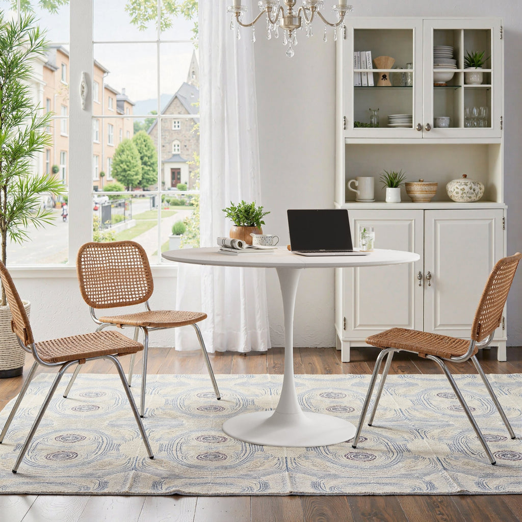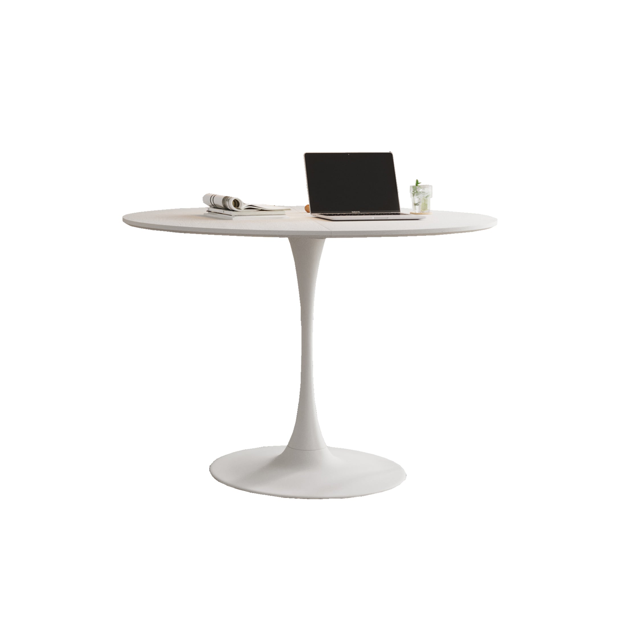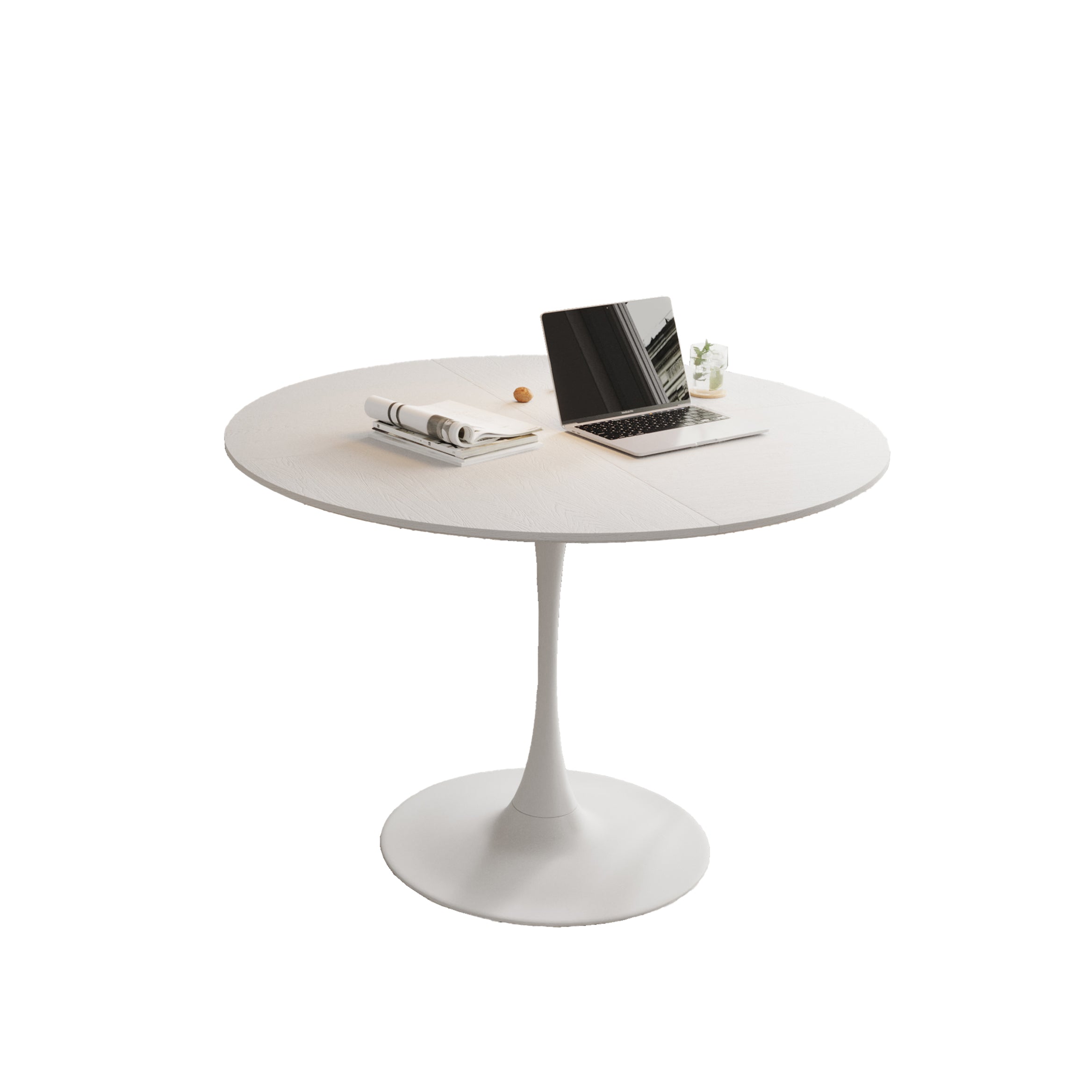 Modern Round Dining Table, Patchwork Tabletops with Metal Base, White Wood Grain