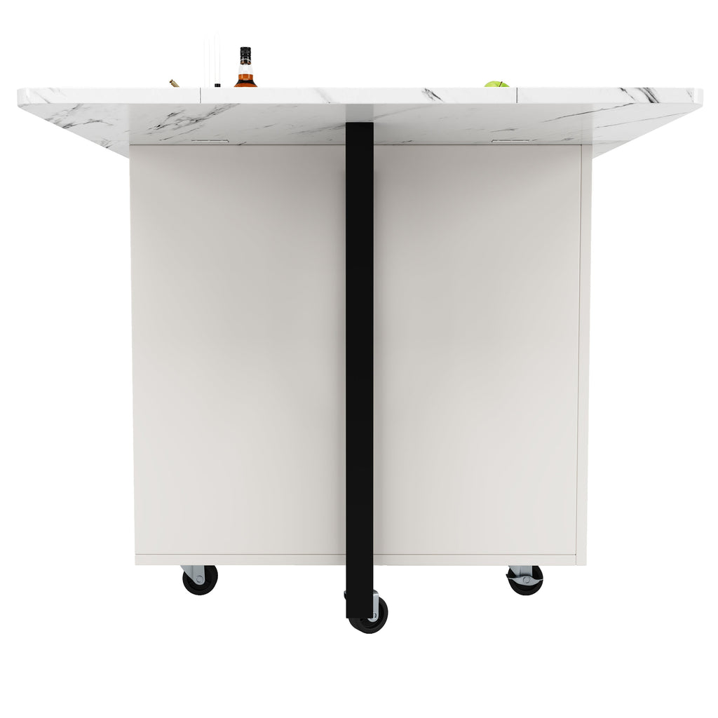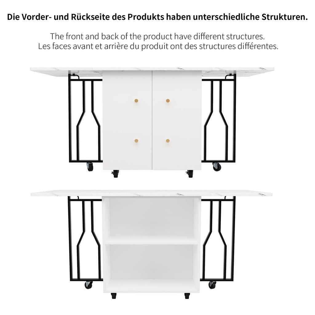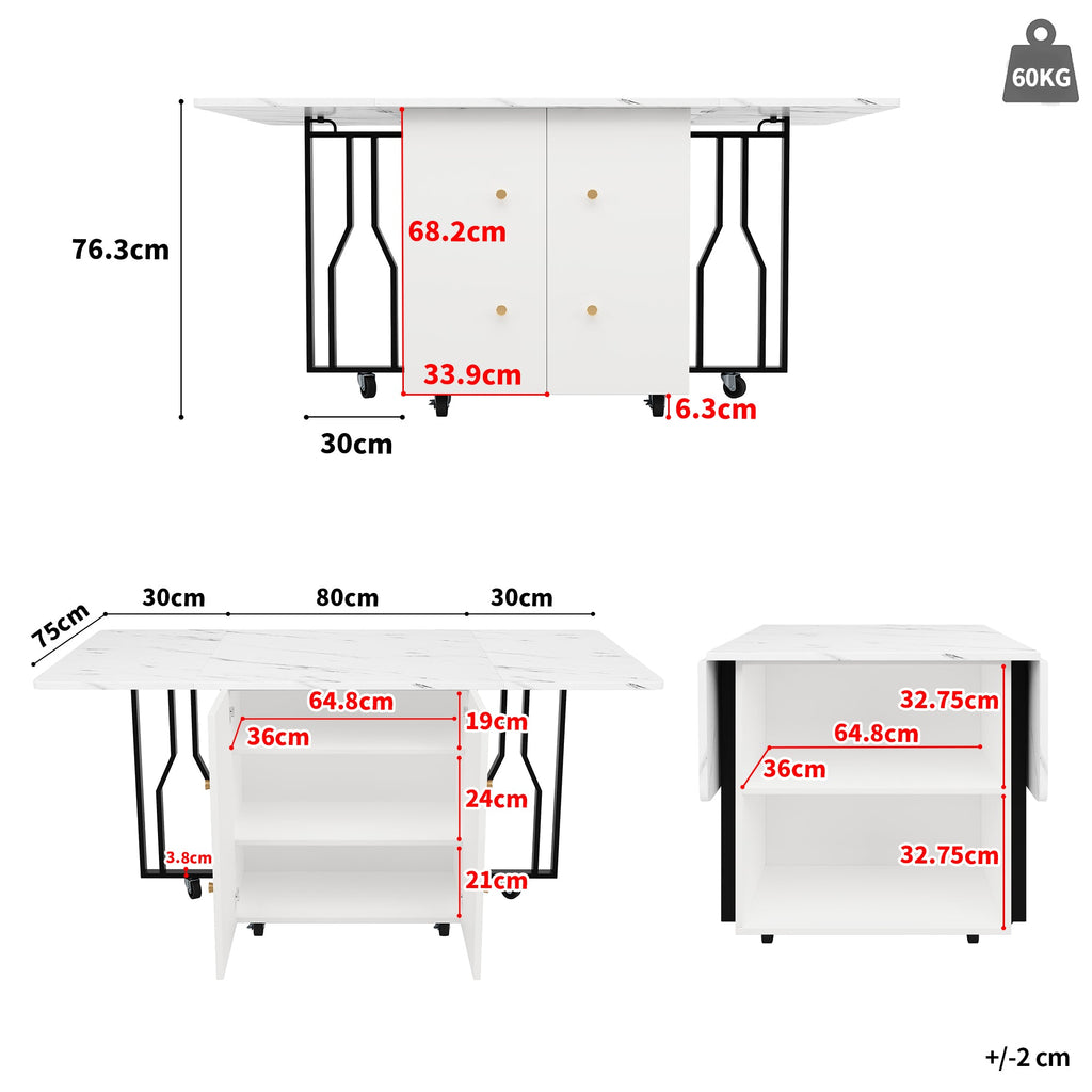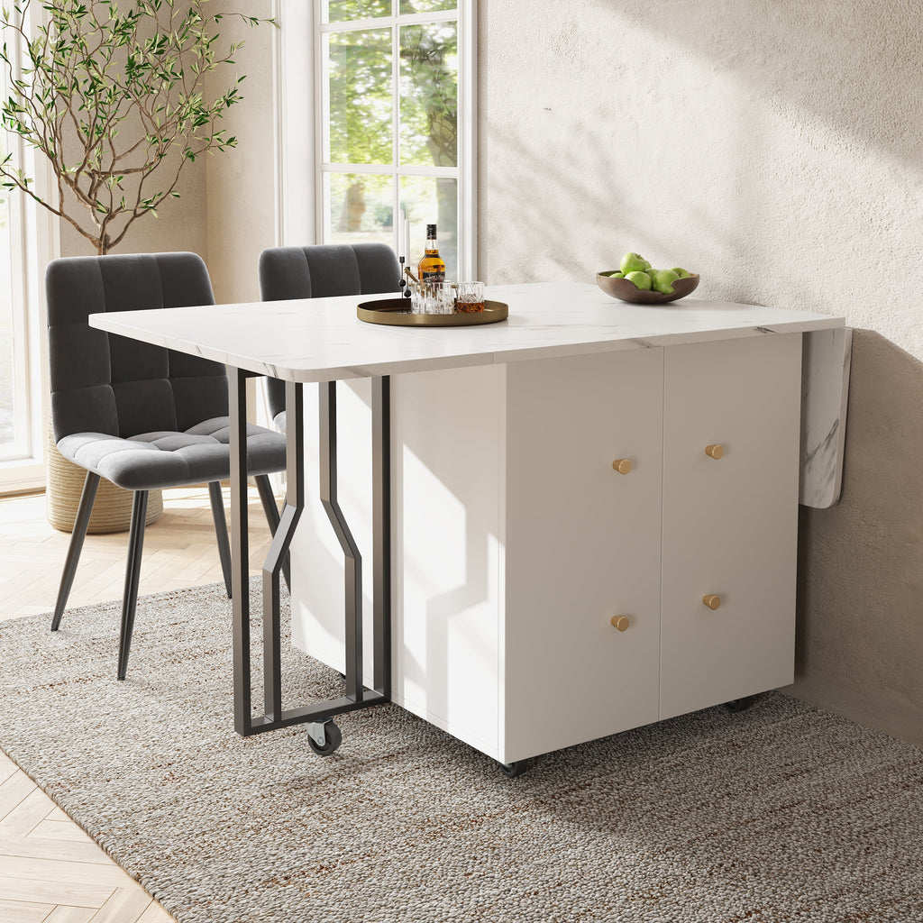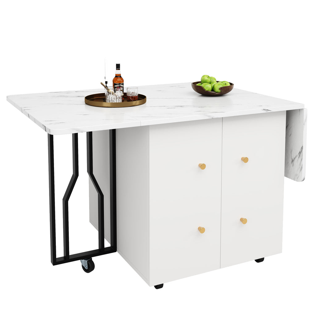 Portable Dining Table, Folding Marbled Top with Storage & Casters, Black Legs