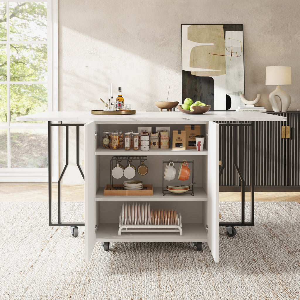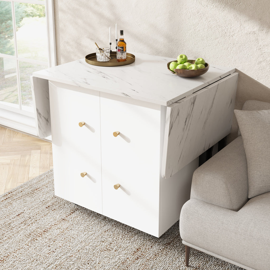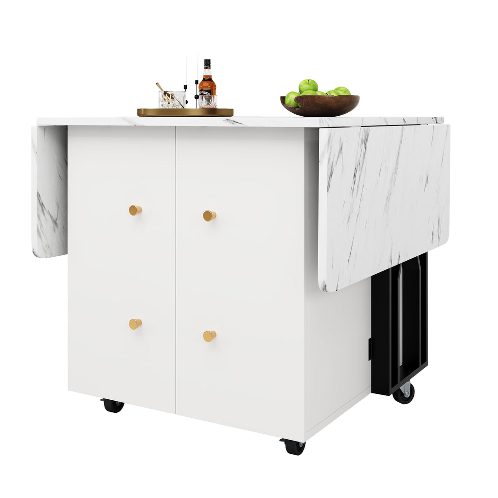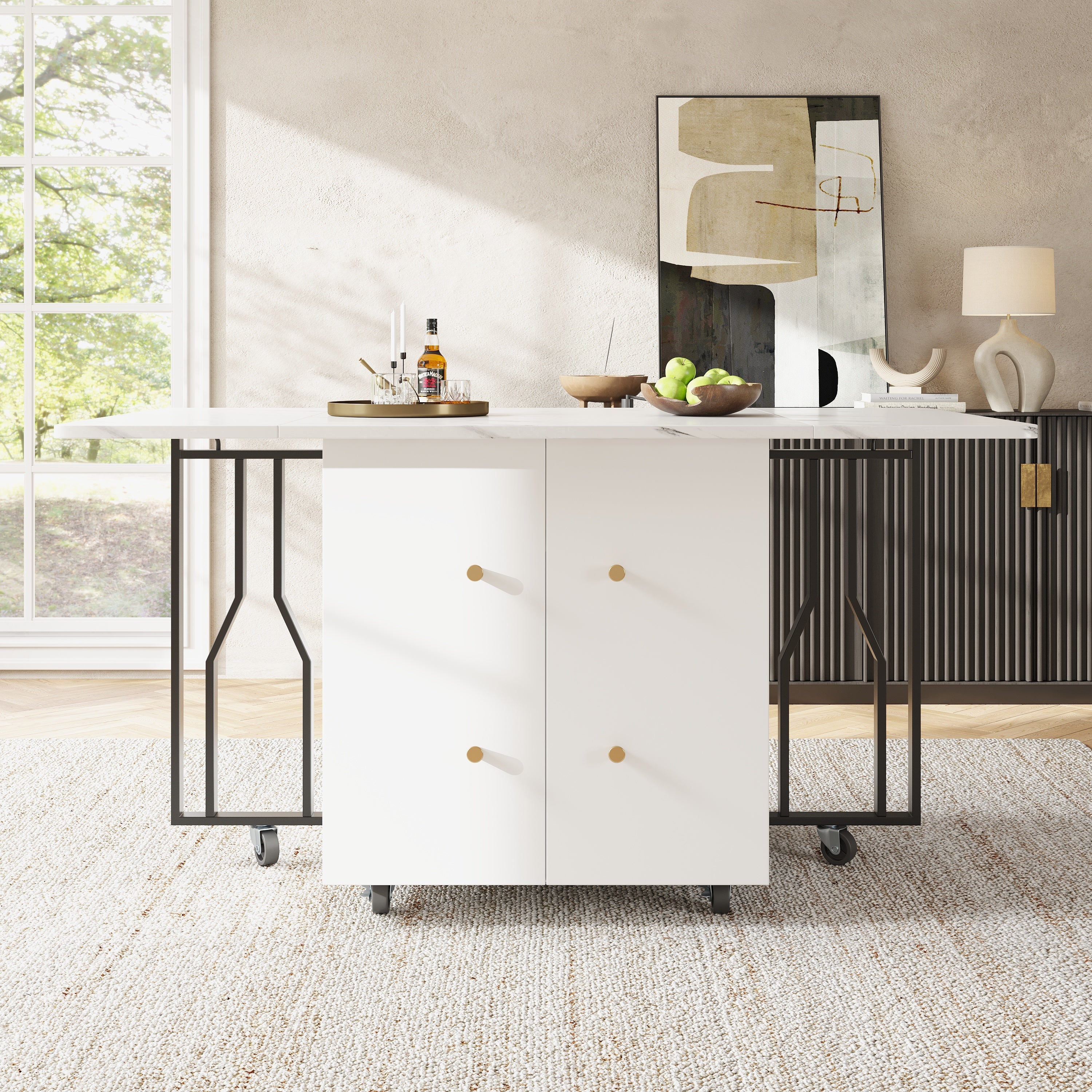 Portable Dining Table, Folding Marbled Top with Storage & Casters, Black Legs