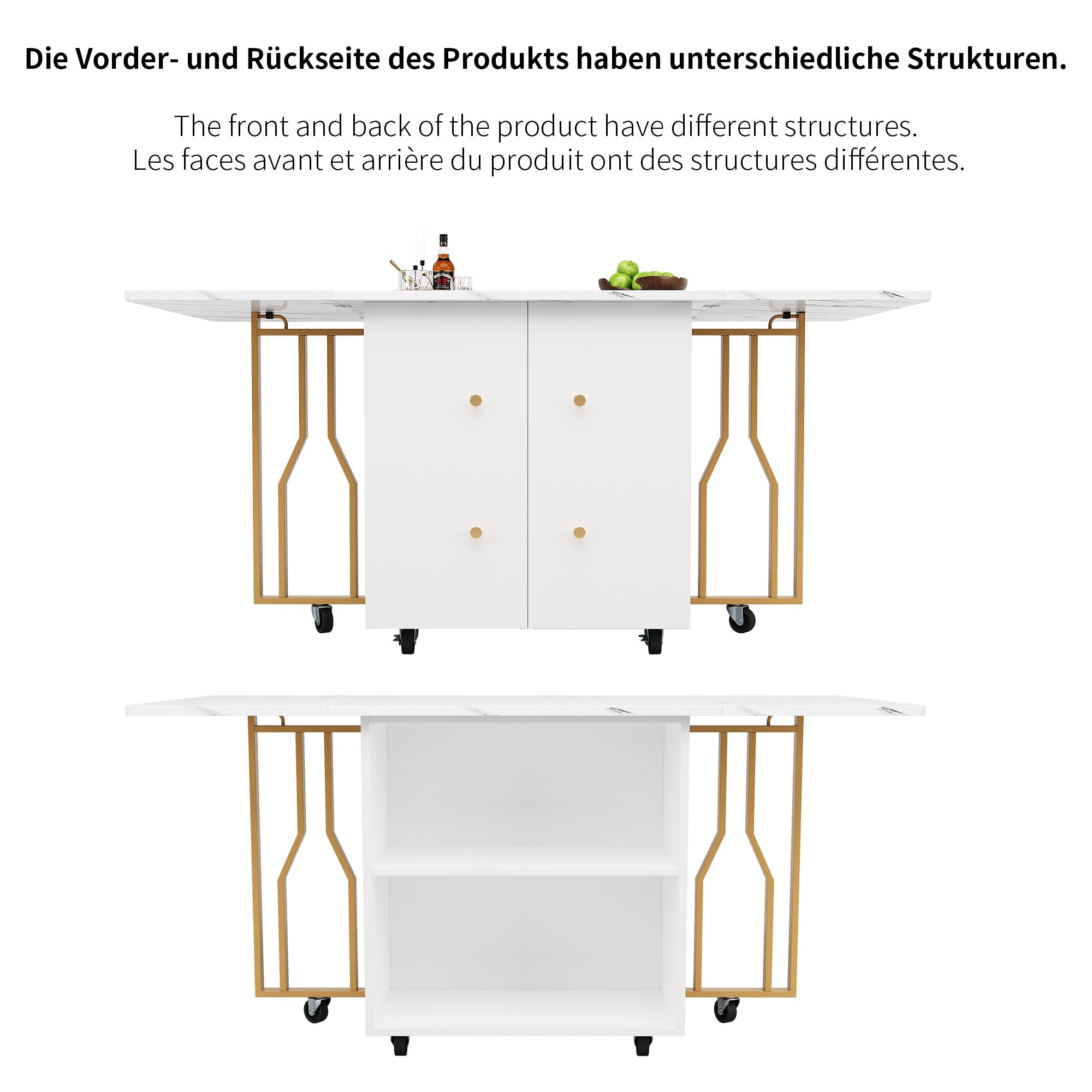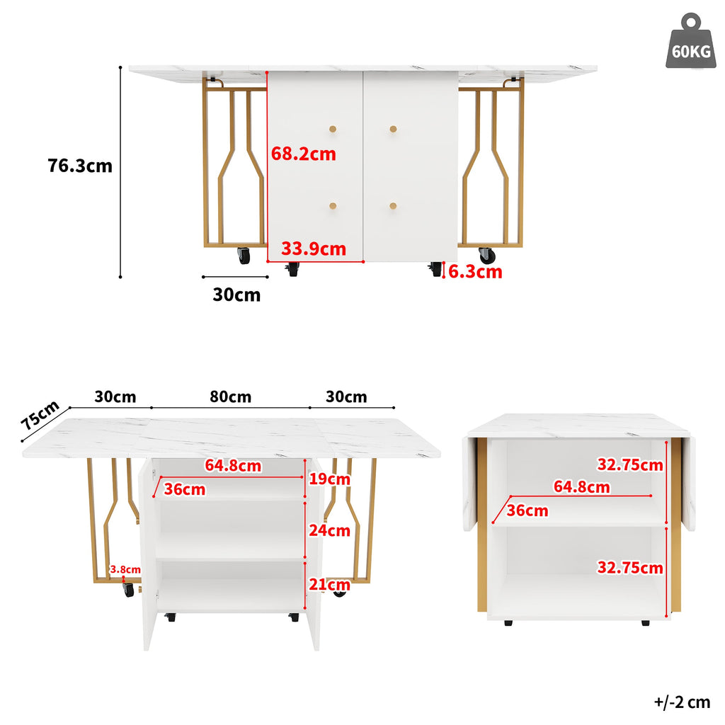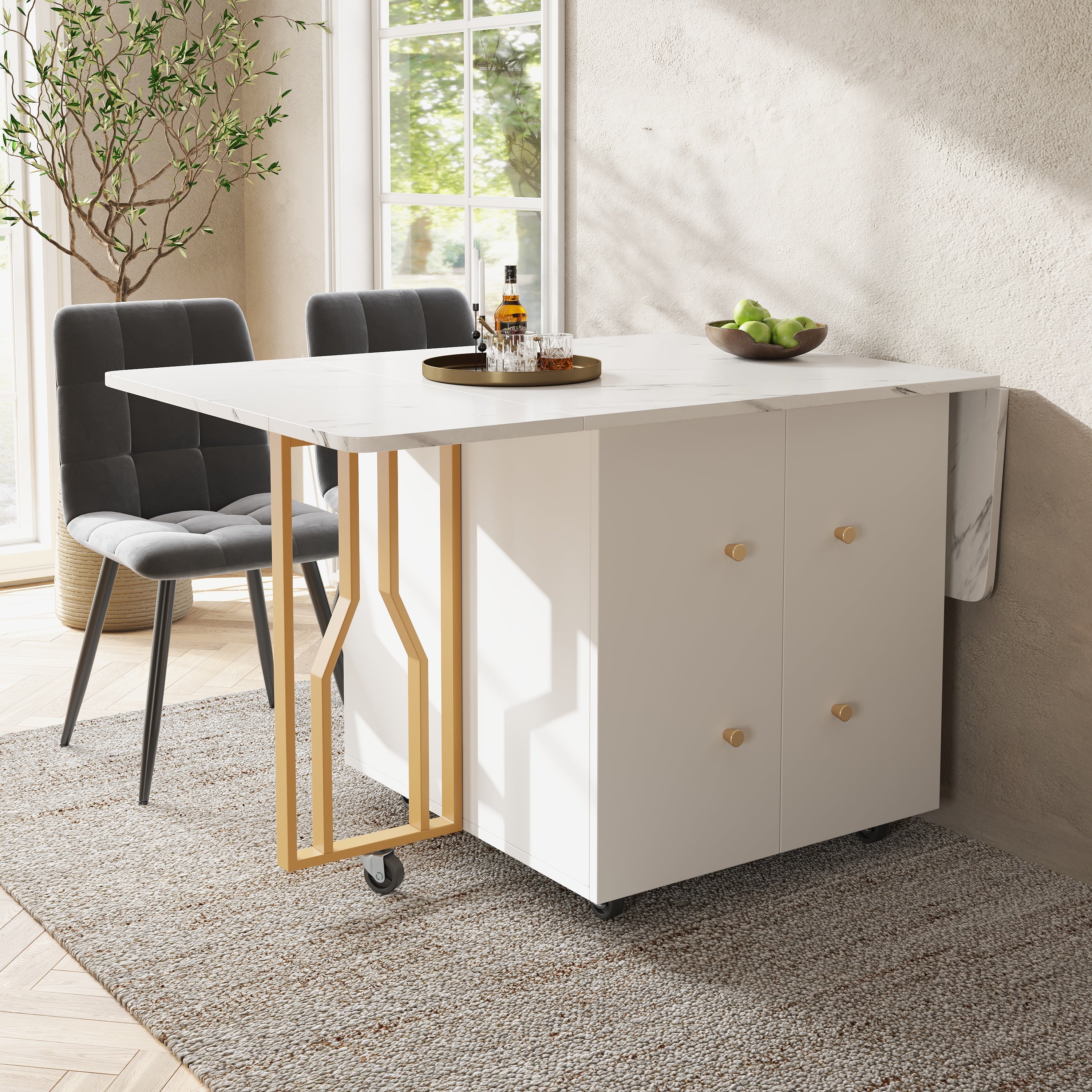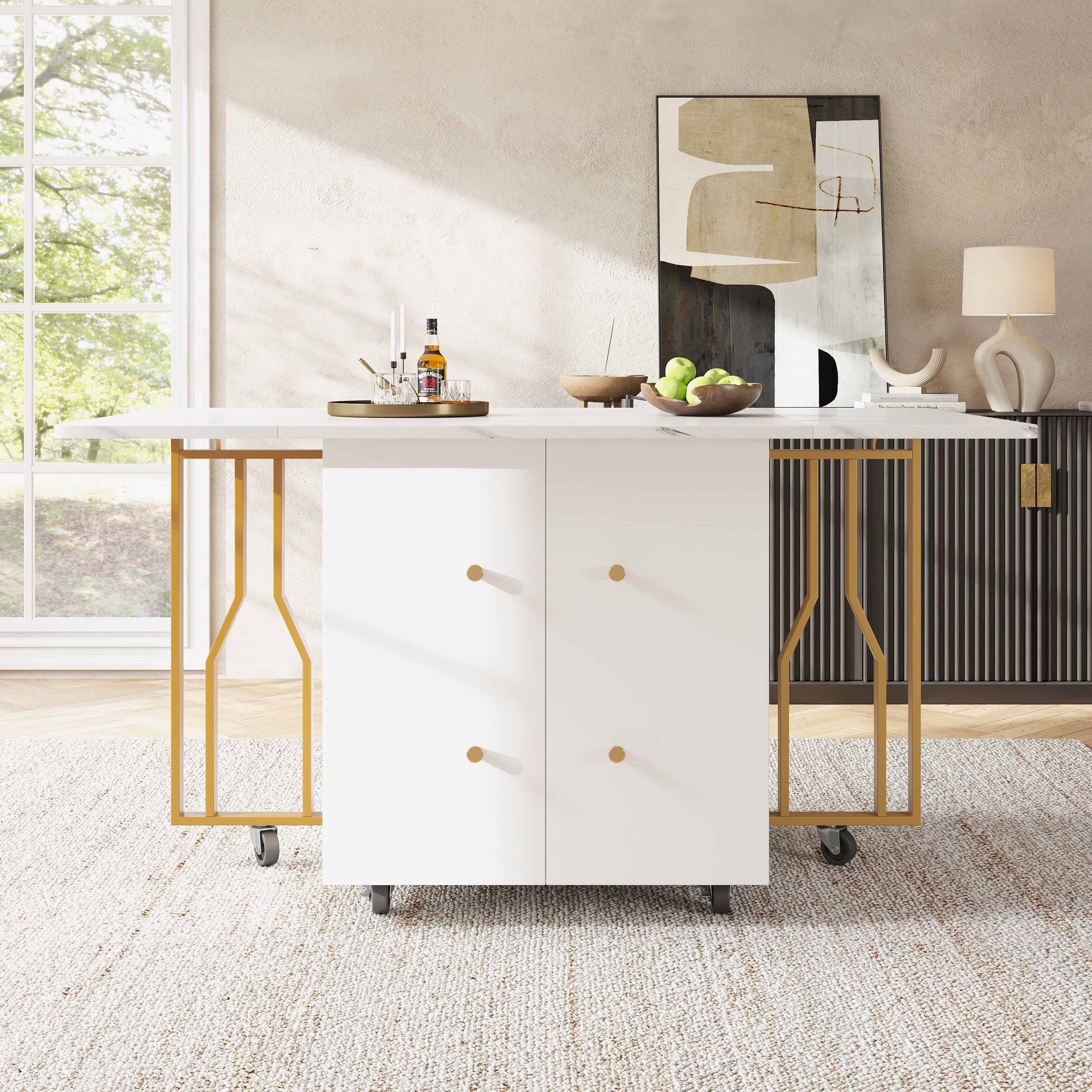 Portable Dining Table, Folding Marbled Top with Storage & Casters, Golden Legs