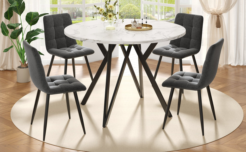 Our round dining table features a thickened MDF tabletop with a realistic marble texture, creating an exquisite pattern that effortlessly enhances any dining atmosphere. The combination of delicate texture and elegant color ensures both durability and a high-quality visual appeal. The sleek metal frame boasts unique, charming lines that outline a classic style. Its geometric structure provides a stable base and highlights the beauty of modern art, while the metallic luster complements the tabletop material, adding unique charm to your living space.