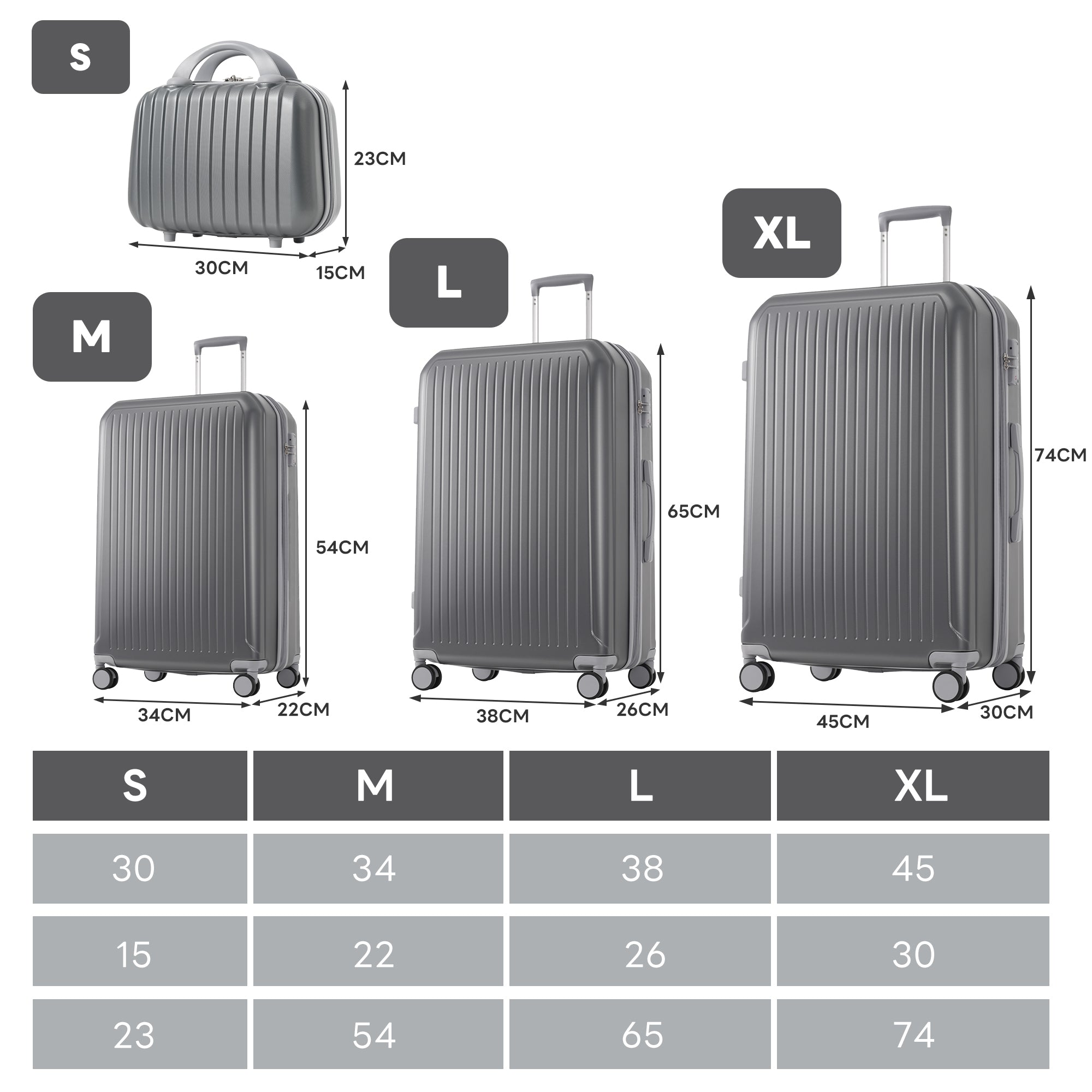 Four-piece set: Includes S (14-inch trolley vanity case), M (20-inch), L (24-inch), and XL (28-inch) suitcases, suitable for short trips, long-distance trips, and family outings.