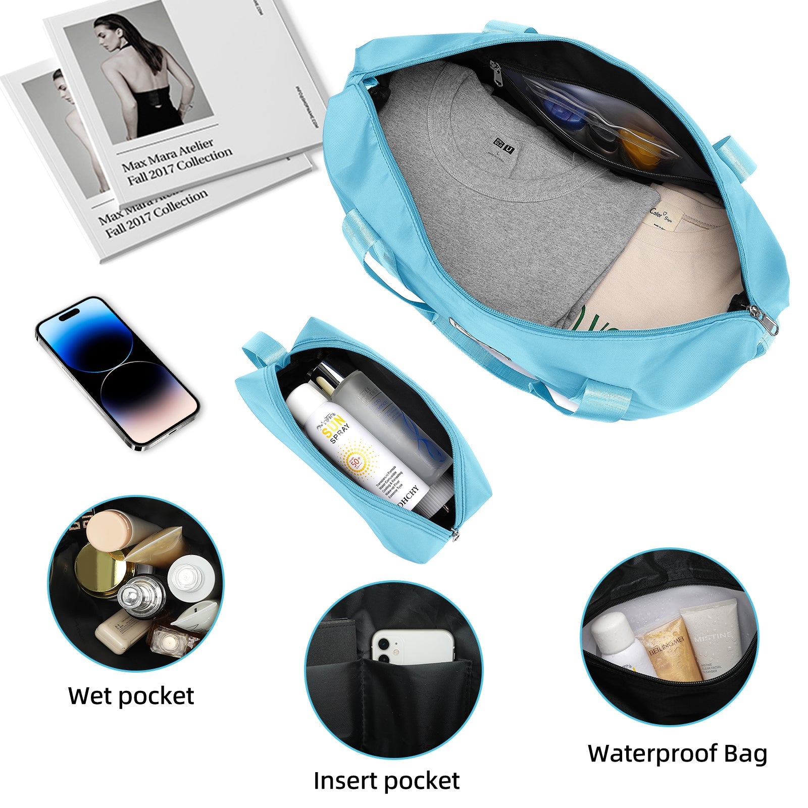 The travel duffel bag and toiletry bag are all made of polyester fabric, which is mildly water-resistant. The duffel bag is also designed with a back sleeve so you can conveniently attach it to the retractable luggage handle.