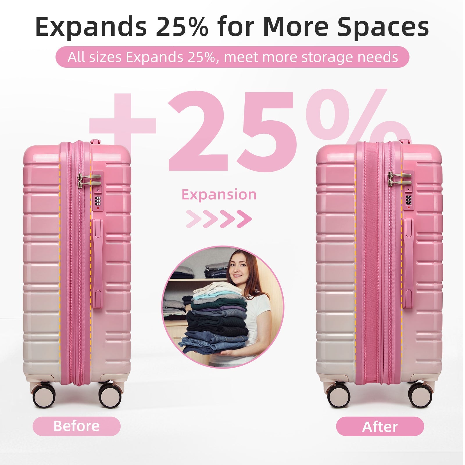 This 5-piece set includes a 20-inch carry-on suitcase, a 24-inch checked suitcase, a 28-inch large luggage piece, a weekender travel bag, and a toiletry bag. Expand the luggage capacity by 25% using the smooth and durable expandable zipper.