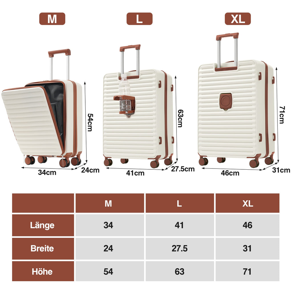 This three-piece luggage set, with its innovative front-opening design and foldable cup holders, is the ideal choice for travelers. The three sizes—M (20 inches), L (24 inches), and XL (28 inches)—are suitable for short trips, family outings, or long-distance journeys. The M and L suitcases feature specially designed front pockets that allow for easy access or storage of frequently used items without needing to open the entire suitcase, increasing the efficiency and convenience of your trip.