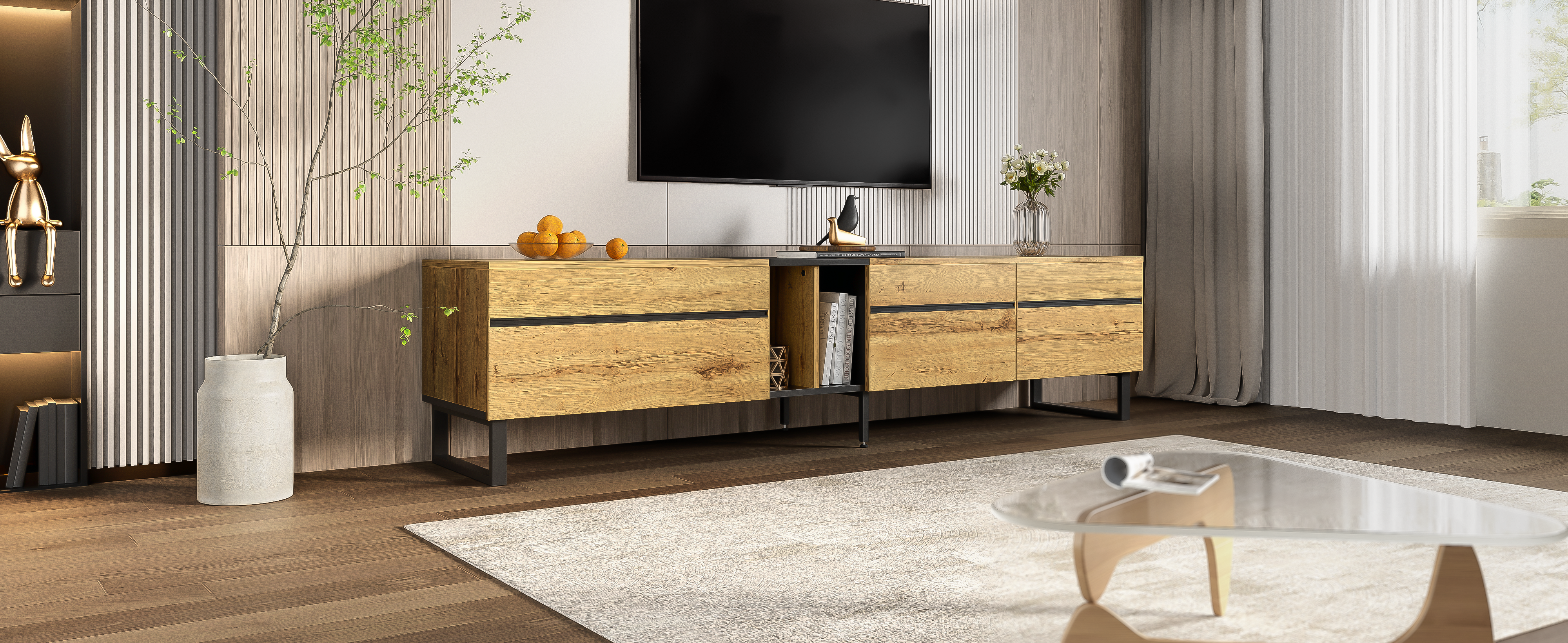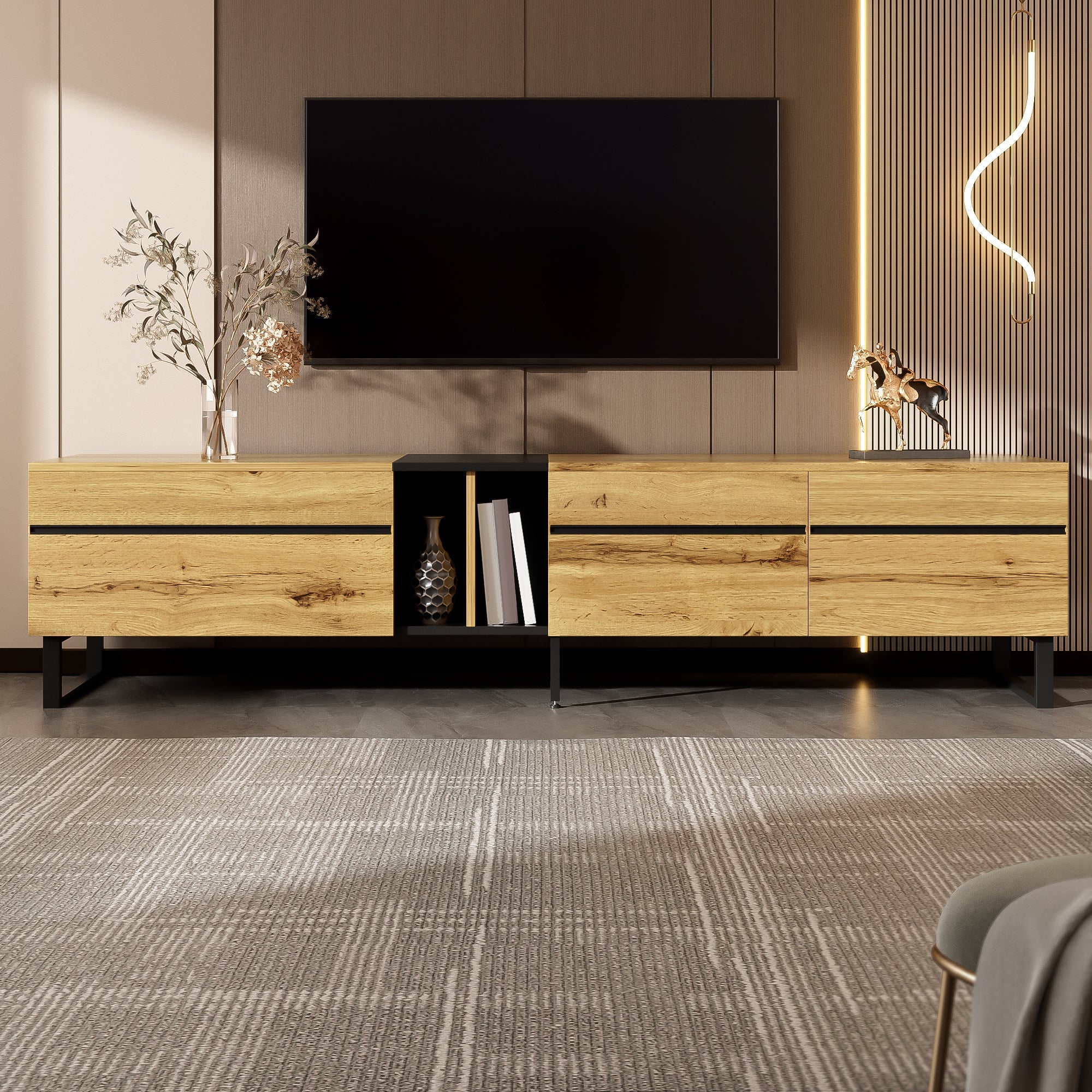 This modern TV stand combines minimalist design with thoughtful functionality, making it the perfect addition to stylish living spaces. With its clean lines, contrasting appearance, and elegant, understated look, it fits perfectly into modern, Scandinavian, and industrial interior design concepts. At the same time, it offers ample storage space and a smart layout for your entertainment electronics and everyday items.
