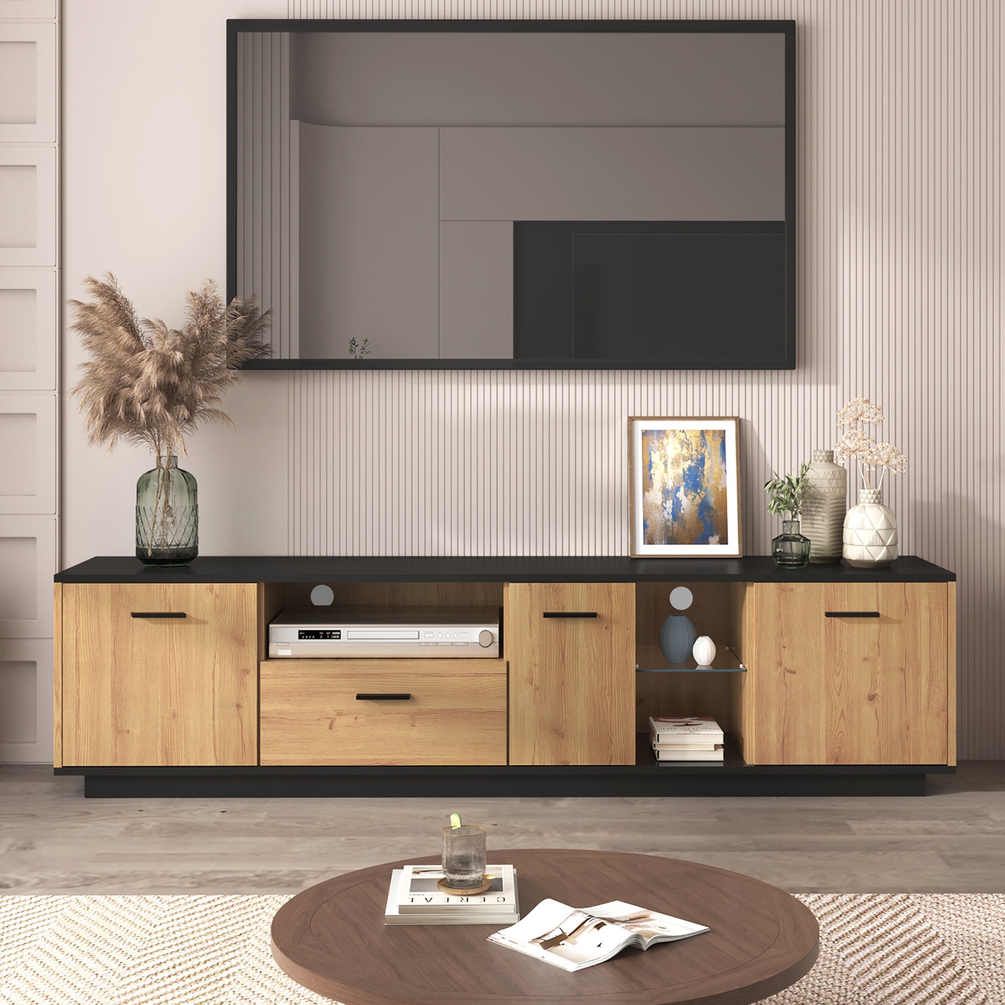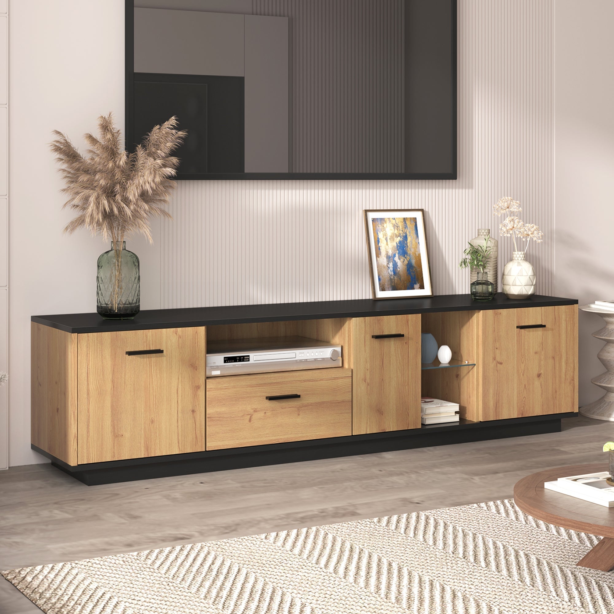 This TV cabinet features a combination of wood and black, creating a simple yet calming visual effect. It includes 16 variable-color LED lights. The cabinet comprises three doors, two glass panels, and a drawer, providing ample storage space for various entertainment devices, books, decorative items, and other belongings.
