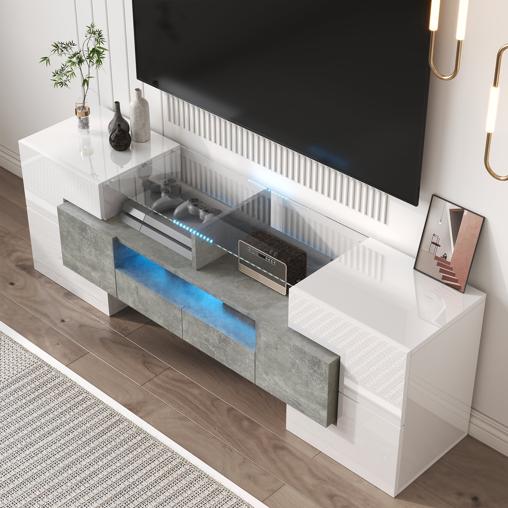 TV Cabinet Lowboard 145cm LED Lighting Modern High-Gloss White