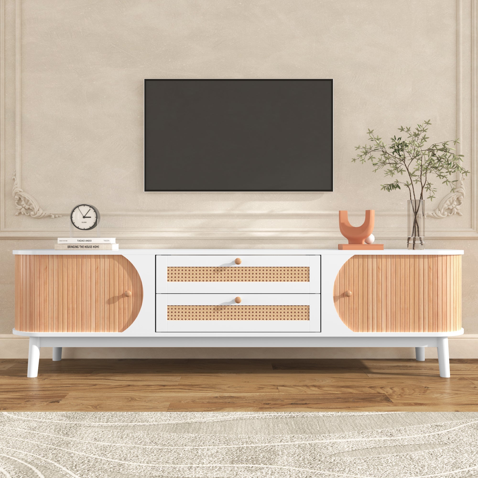 TV Cabinet Wood Blend, Doors Drawers Rattan Sides, Natural Country Style