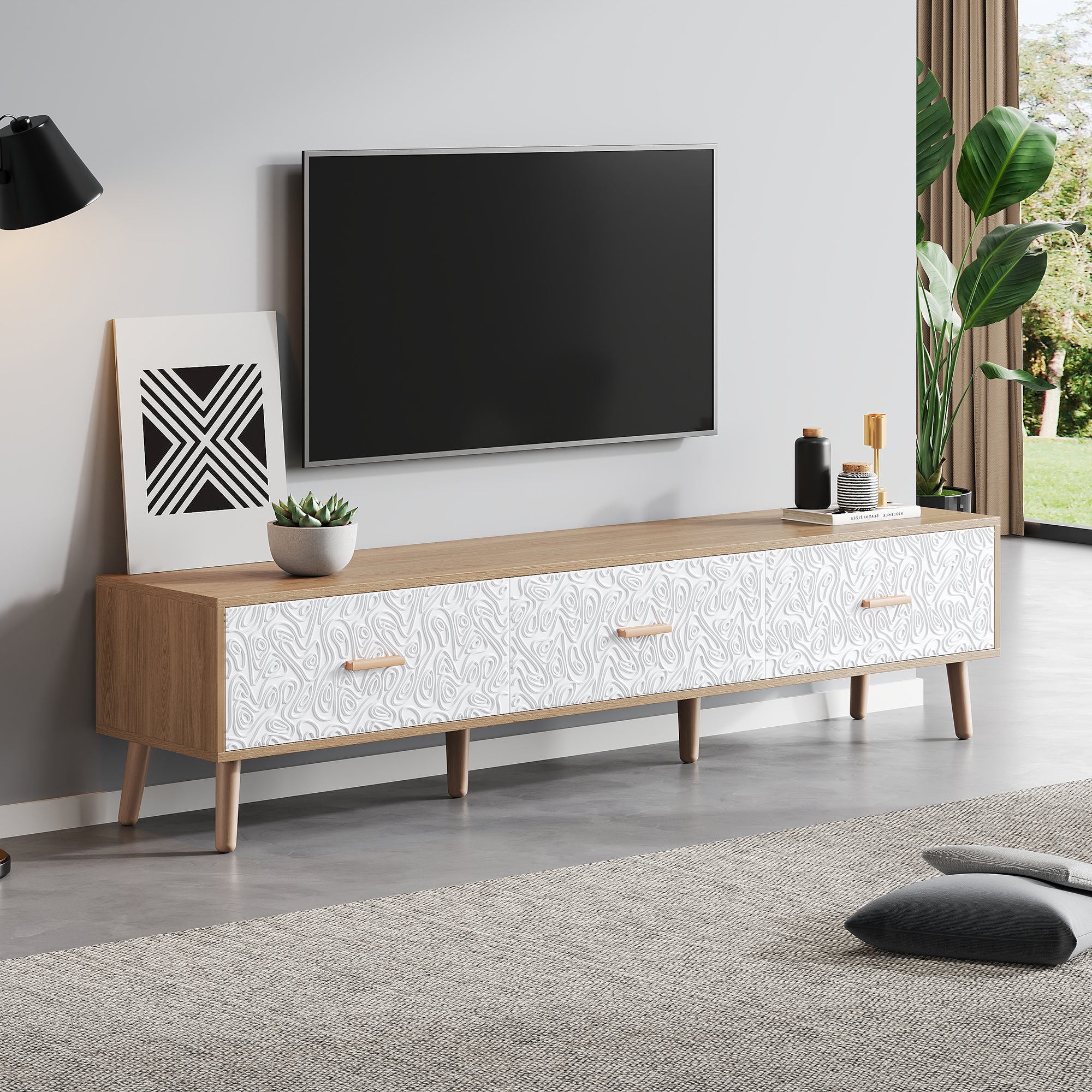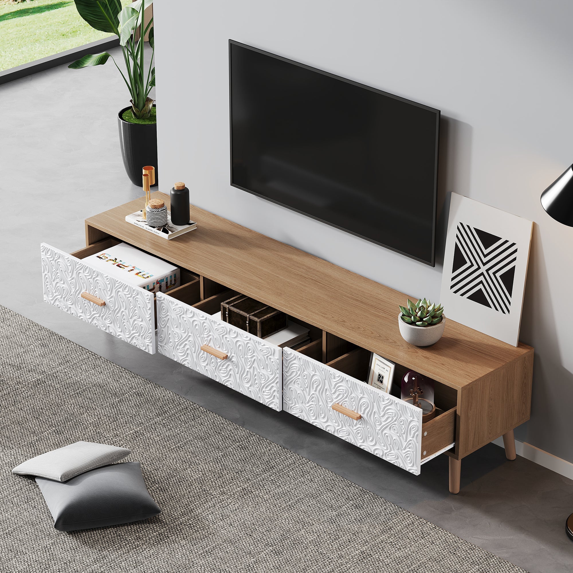 Enjoy organizing with our functional cabinets. The TV cabinet offers plenty of storage space for entertainment electronics, DVDs, and books. Practical storage solutions help keep your living room tidy. One of the cabinet's highlights is the unique white textured cabinet door, paired with three large drawers. It offers convenient storage and is also a unique piece of furniture.