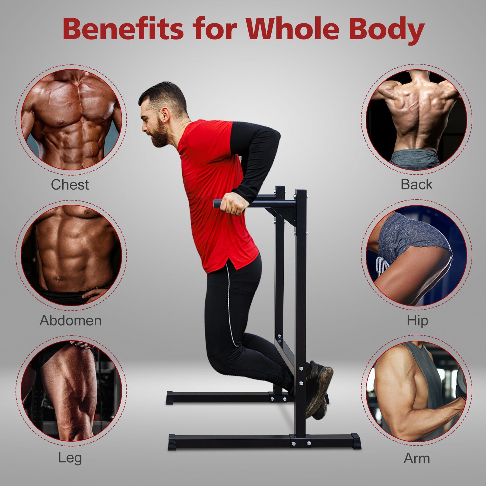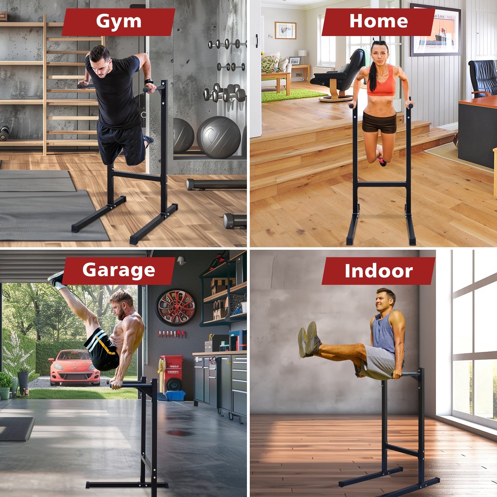 This multi-functional dip station is perfect for a variety of upper and lower body exercises, such as pull-ups, L-sit holds, tricep dips, and leg raises. The dip stand is helpful for exercising and strengthening your full body, including your shoulders, chest, abdomen, back, arms, and legs.