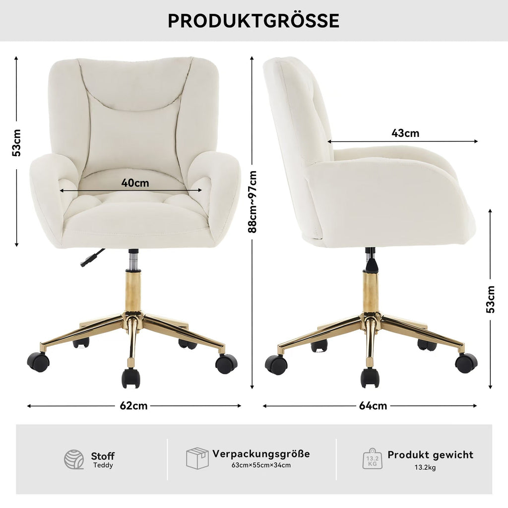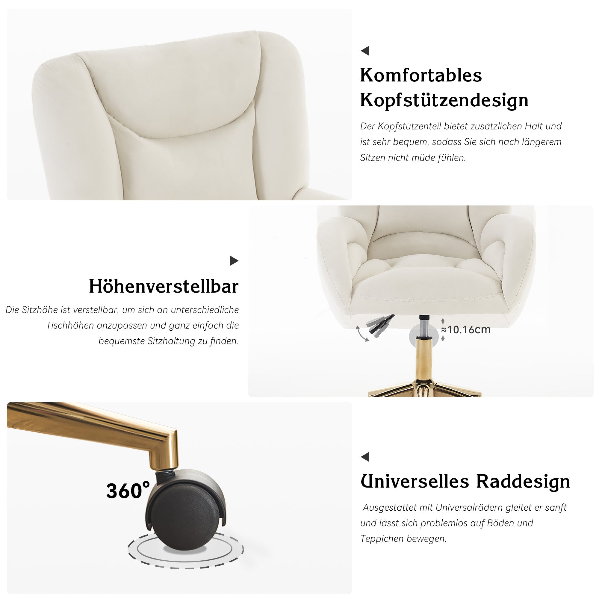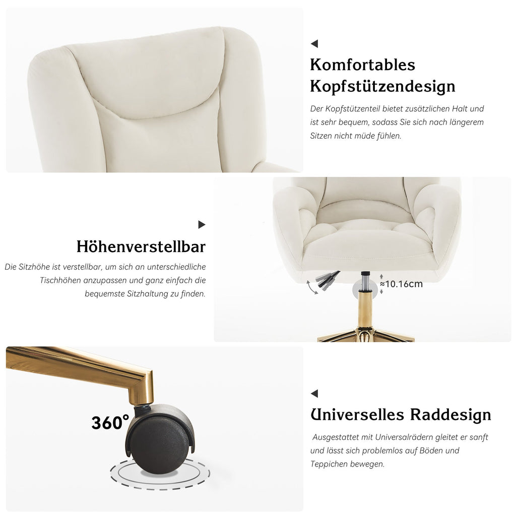 Swivel Casters + Adjustable Height: Custom-Made Freedom and Comfort! The 360° swivel casters allow you to glide effortlessly, and the adjustable gold base adapts to any table and situation: office, bedroom, vanity, or even a temporary cat perch!