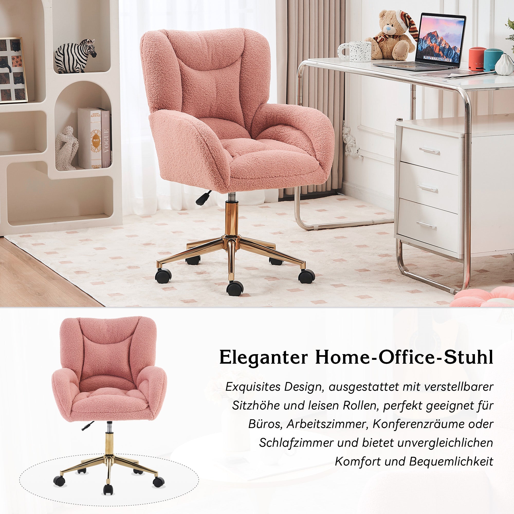 5. Swivel Casters and Adjustable Height: Freedom and customized comfort\! The 360° swivel casters allow you to glide effortlessly, and the adjustable base adapts to all tables and situations: office, bedroom, hairdresser, or even temporarily for a chat\!Product composition: Complete KD fabric frame made of teddy fleece + foam padding + metal frame + adjustable gold-plated base + 360° swivel casters.
