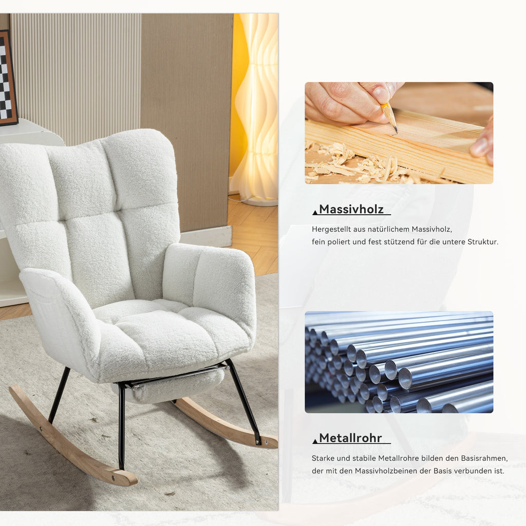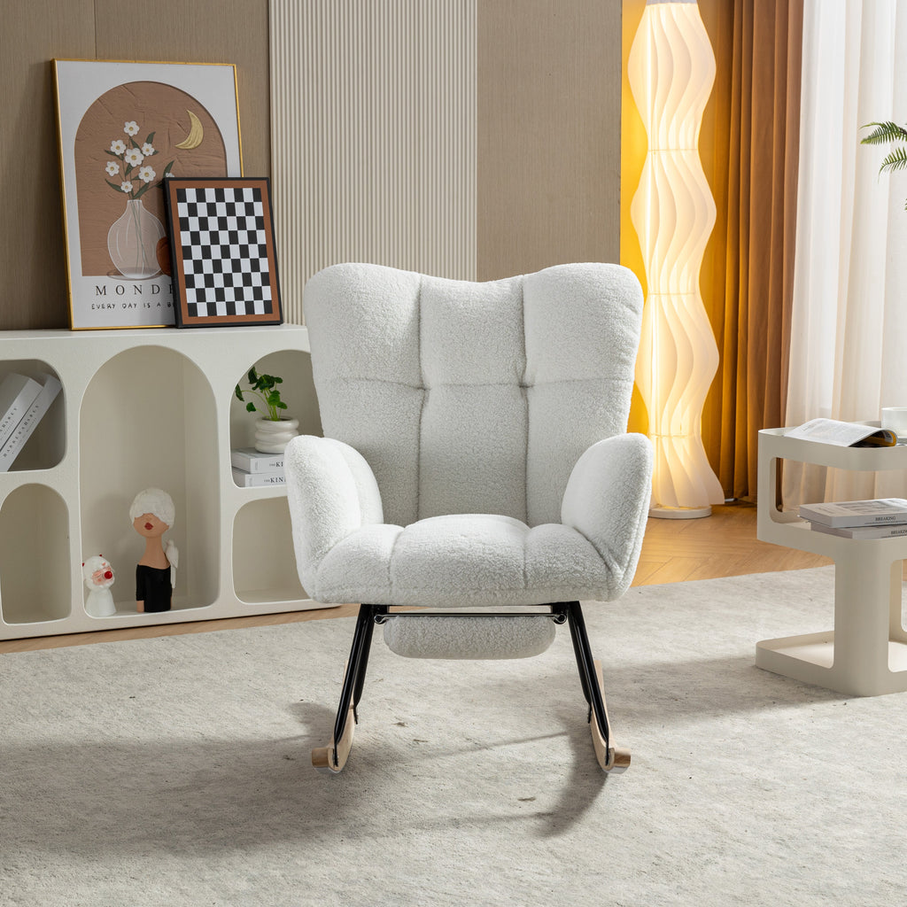 009B Rocking Chair, Upholstered with Retractable Footrest, White Teddy Fabric