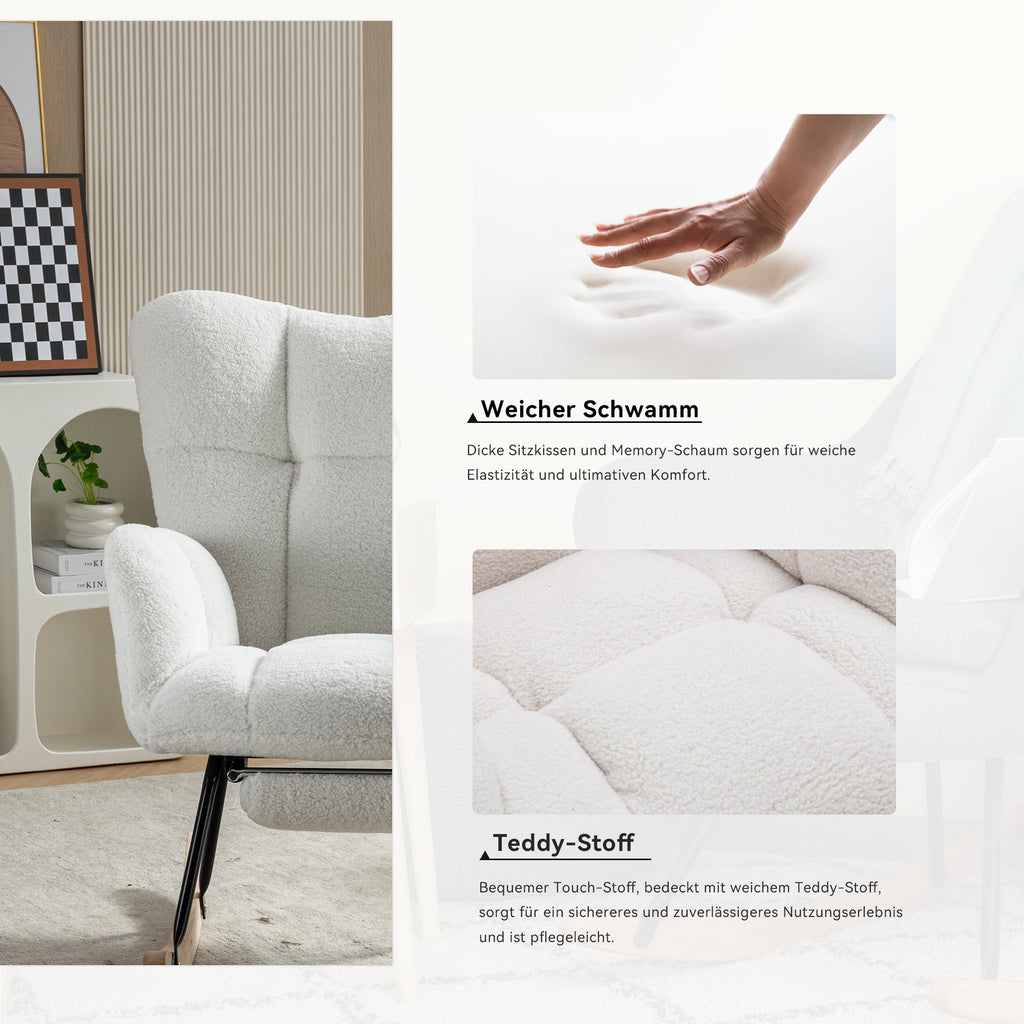 EN:1. Ultimate Comfort: This rocking chair is crafted from soft, pleasant-to-the-touch fabric, featuring a tufted design and a thick sponge backrest, offering you an unparalleled seating experience. Whether you're relaxing in the living room with its gentle motion or taking a nap in the bedroom, this rocking chair provides warm companionship, allowing you to fully enjoy your private time.