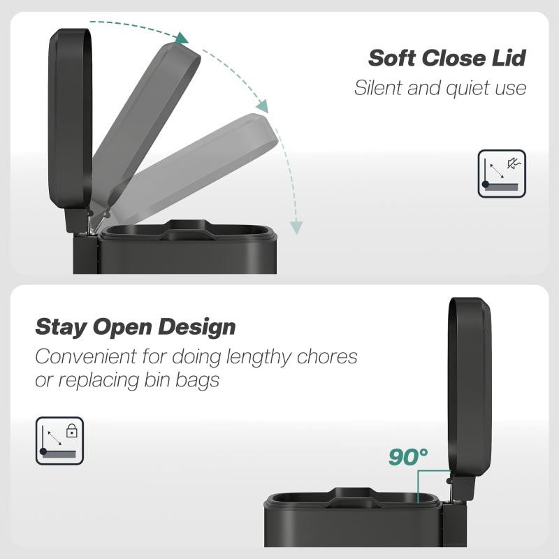 It features a pedal opening with a soft-close lid. Simply press the pedal to open the lid of this rubbish bin. It closes gently so it does not disturb your family.