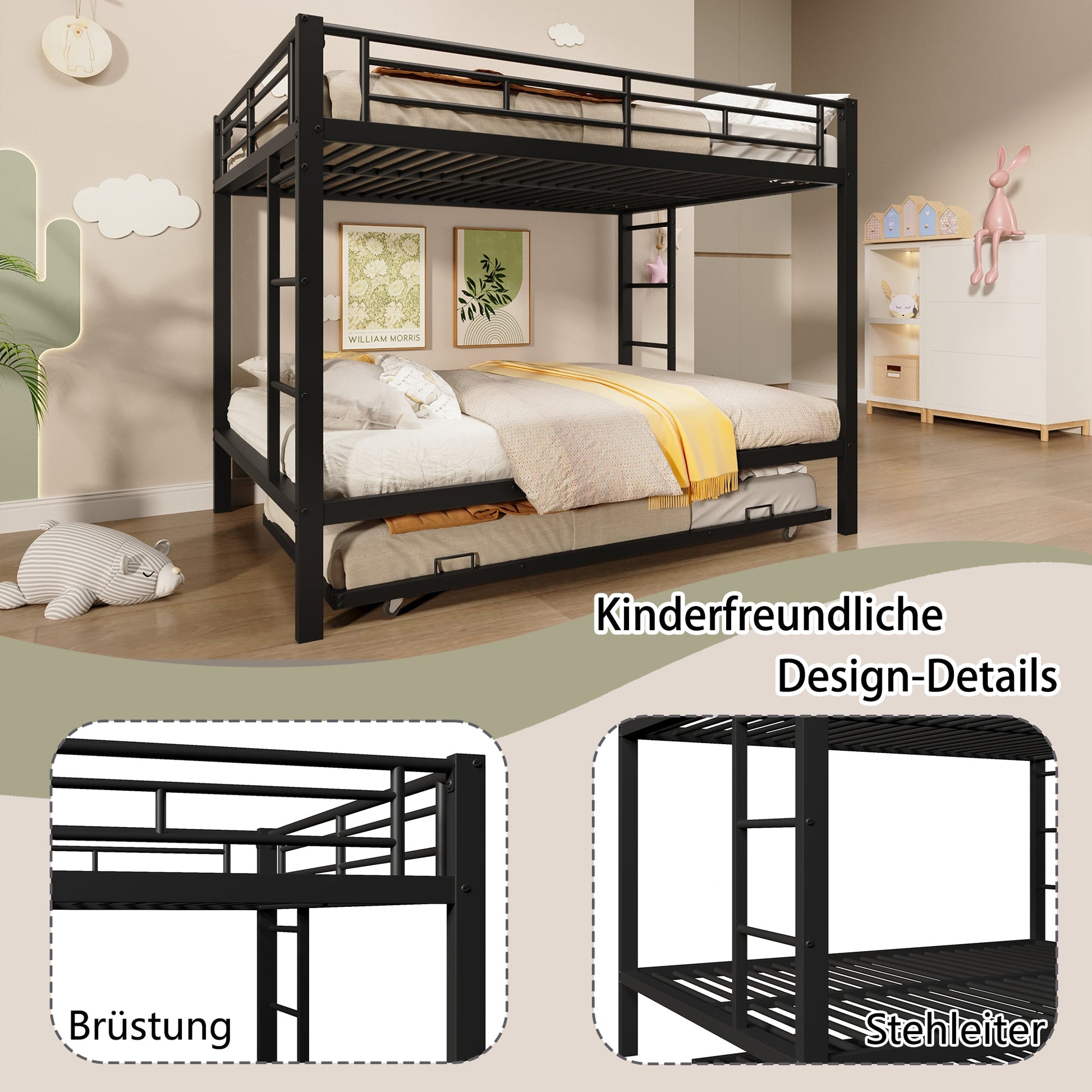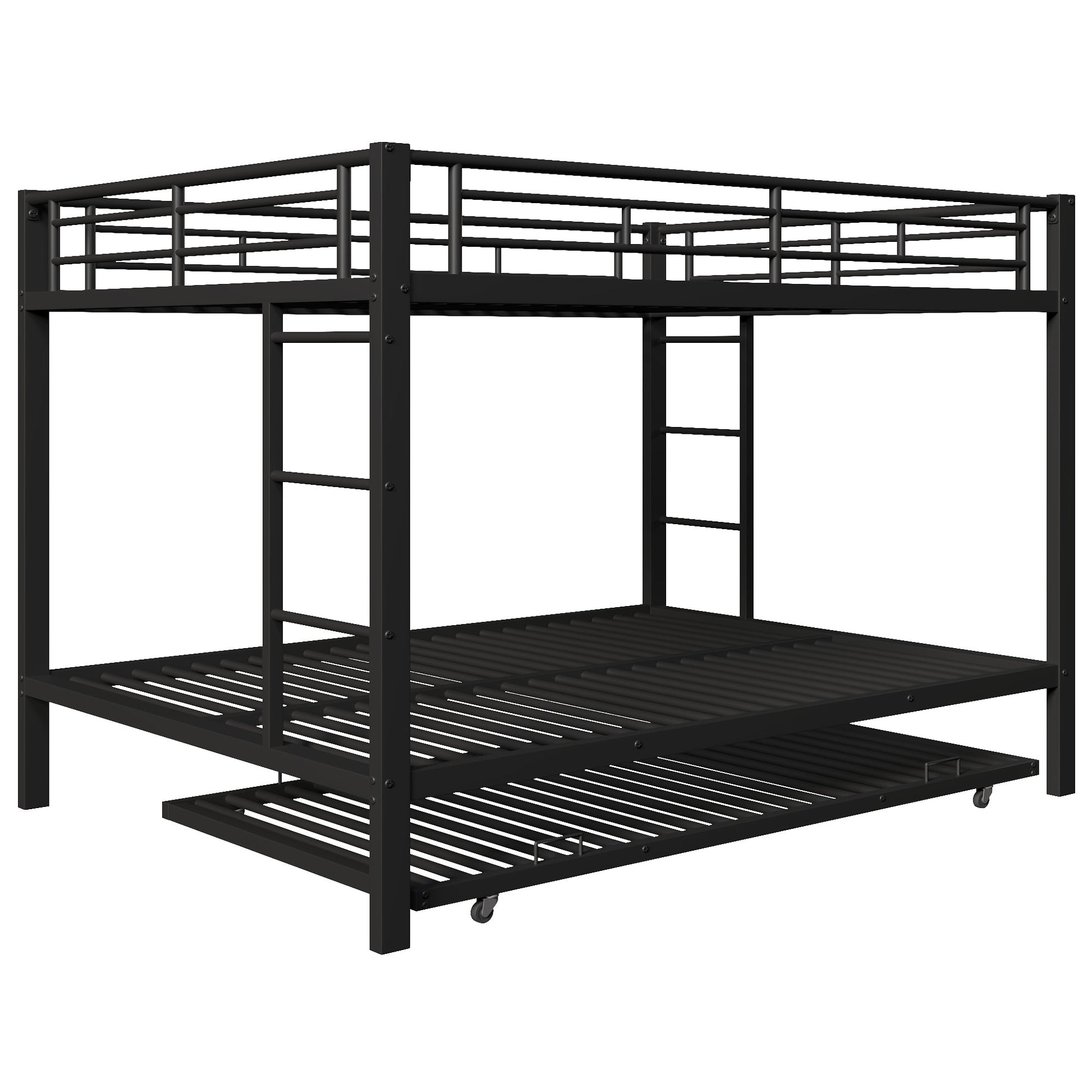 140*200cm Bunk Bed with Pull-out Bed and High Railings, Iron, Black