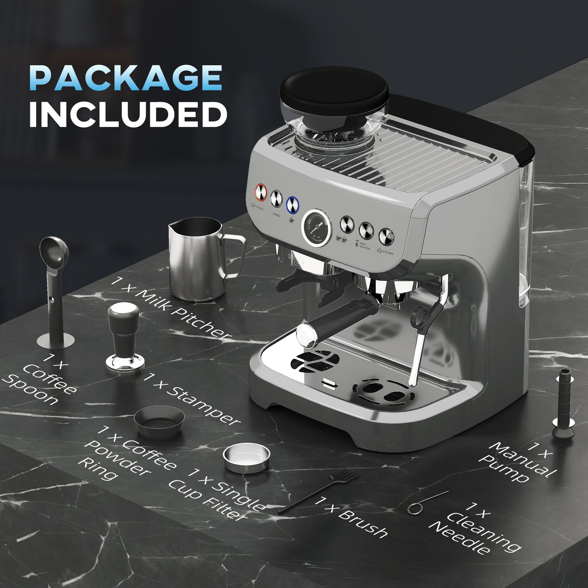Complete Barista starter kit:Includes a removable 2L large water tank, milk frother, portafilter, tamper, single cup filter, dosing spoon with press, anti-leak ring, cleaning brushand needle – everything you need to brew cafe-quality drinks.