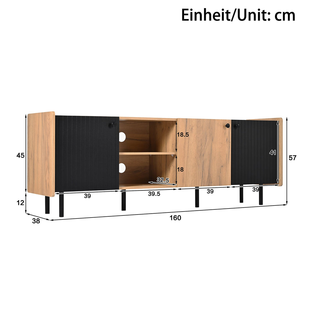 160 cm TV Cabinet, Modern Style, Three Doors, Two Open Compartments, Black and Wood