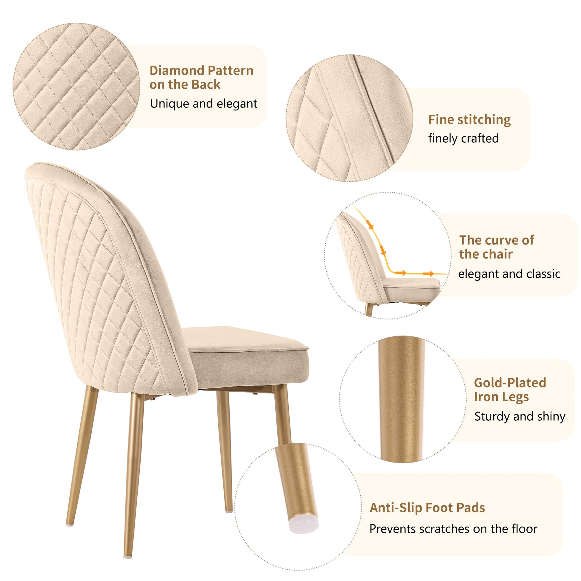This velvet dining chair not only offers a stylish aesthetic but also ensures everyday practicality through thoughtful details. Each chair leg is equipped with durable, non-slip pads that effectively prevent the chair from sliding on smooth floors and protect the floor from scratches, giving you greater peace of mind during use.