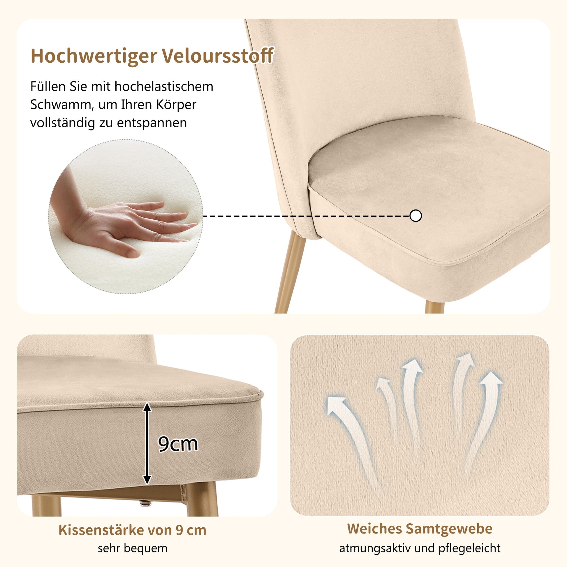 2 Dining Chairs Modern Comfortable Gold Metal Legs Beige Velvet