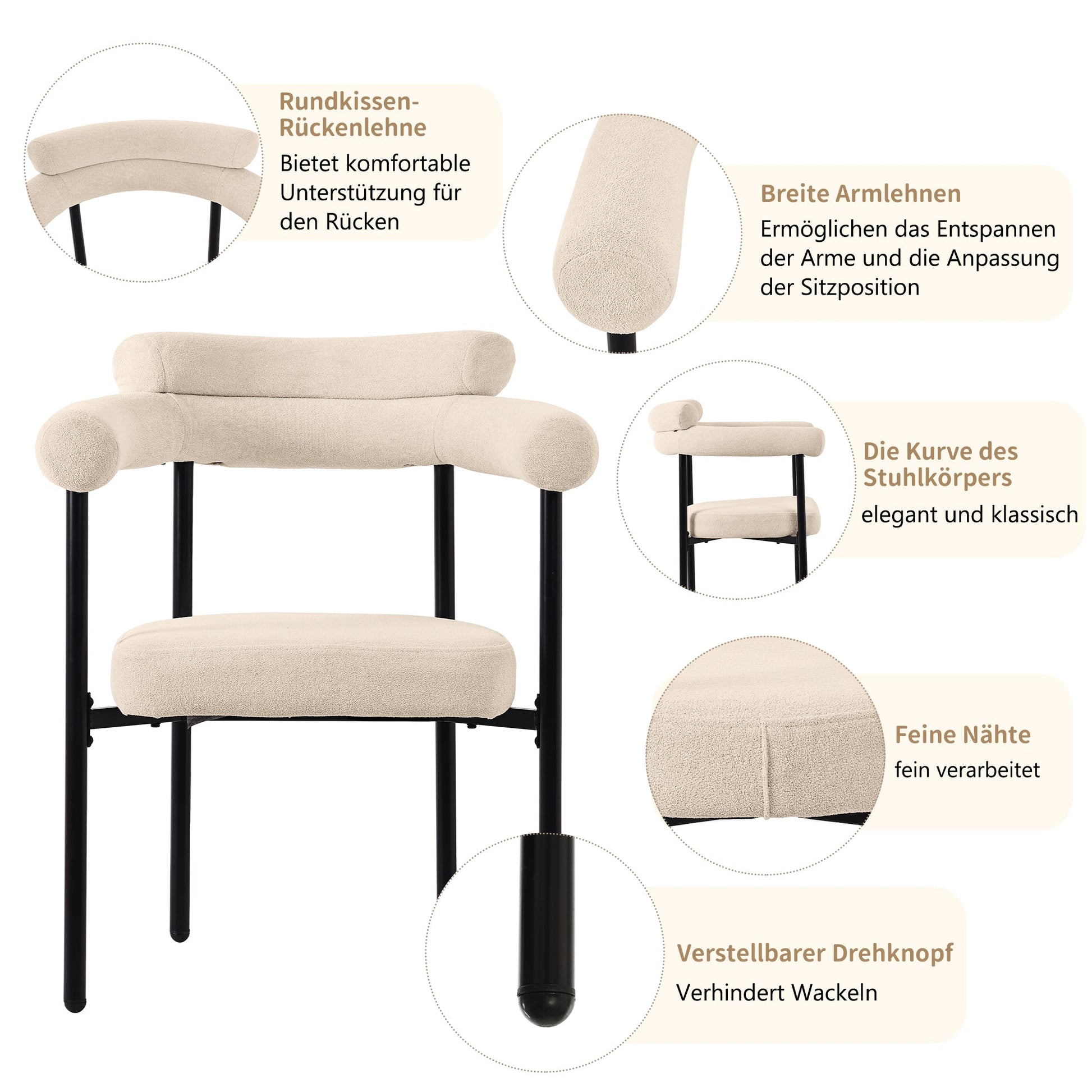 Our armchairs are designed according to ergonomic principles, and the angles of the backrest and seat are carefully adjusted to ensure the backrest perfectly conforms to the natural curve of the spine, providing complete support for the waist and back. This design effectively reduces fatigue caused by prolonged sitting and helps users maintain healthy sitting habits, which is especially beneficial for those who work or eat for extended periods. Furthermore, the backrest is at a moderate height, making it suitable for people of all body types. You'll immediately feel the all-around comfort and enveloping support as soon as you sit down. Whether for everyday use or social occasions, this chair offers a comfortable experience.