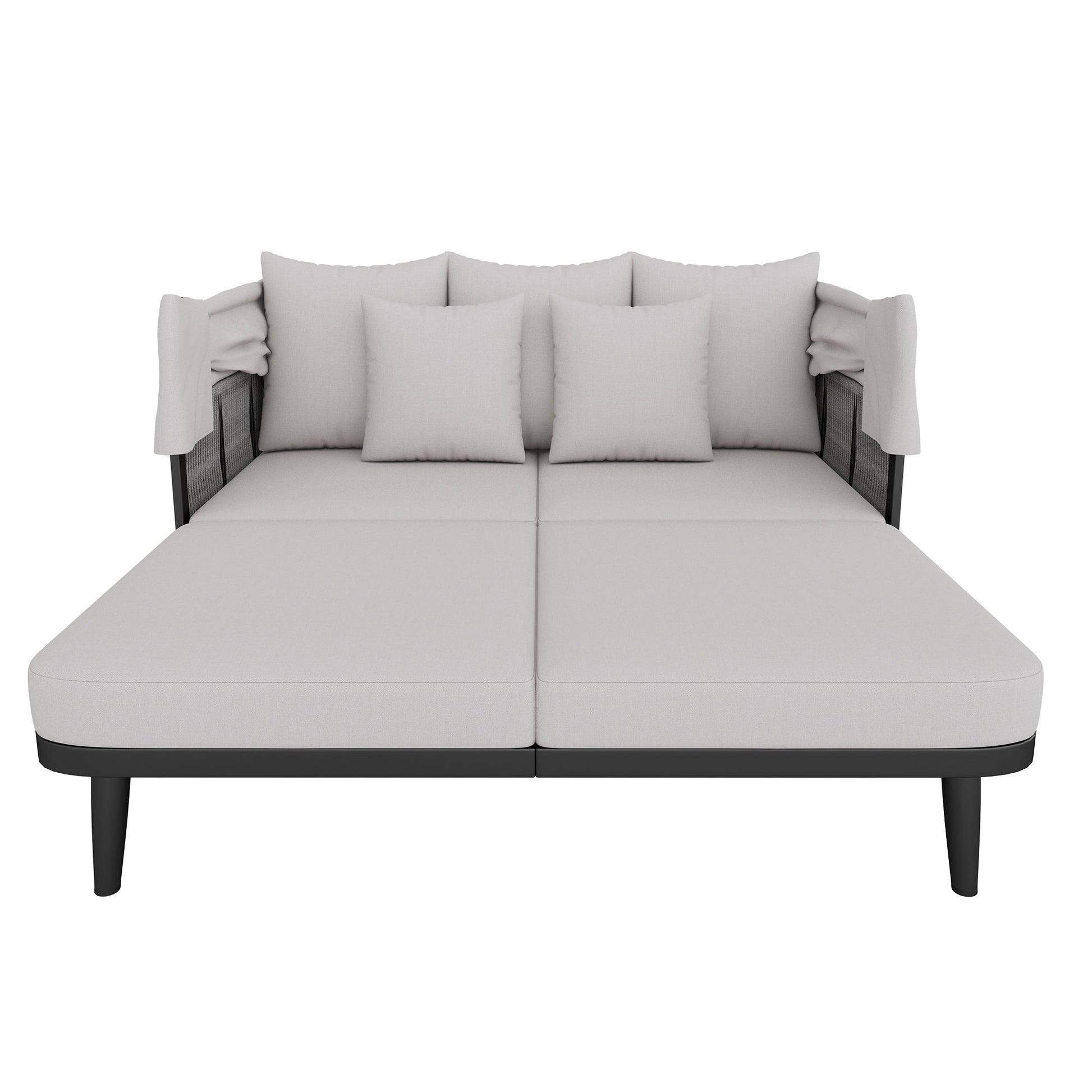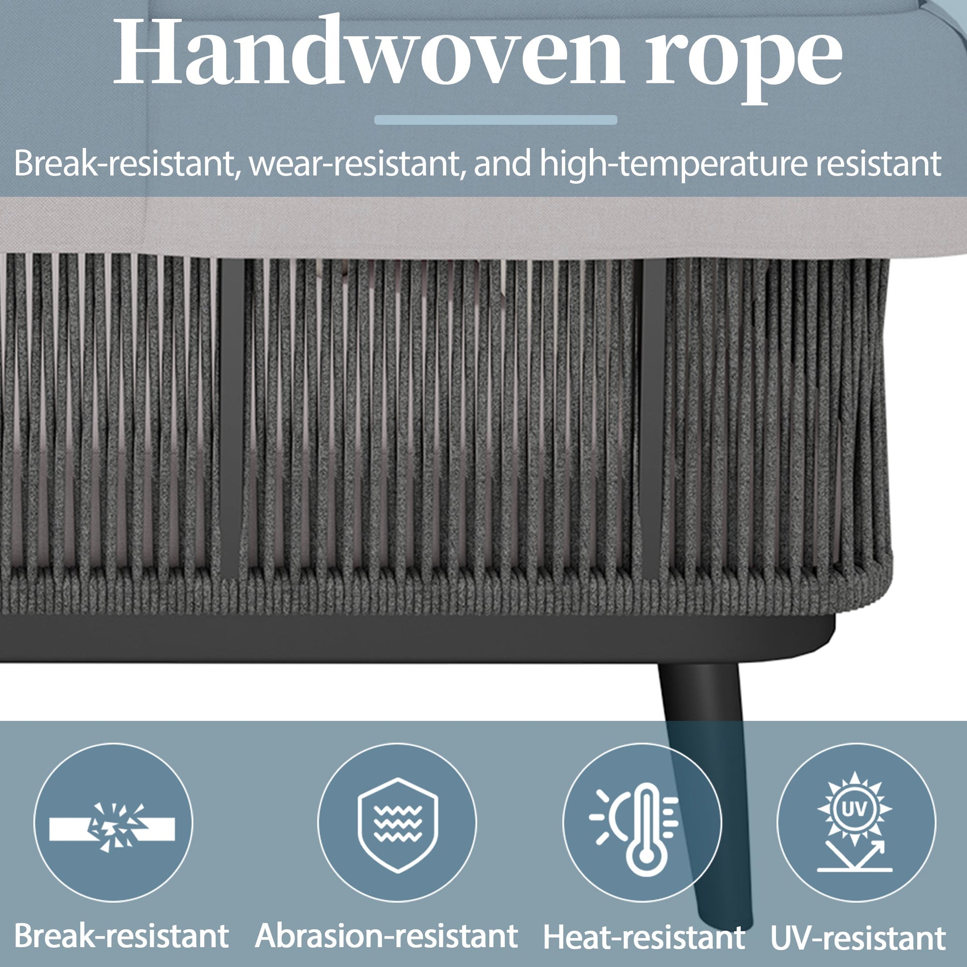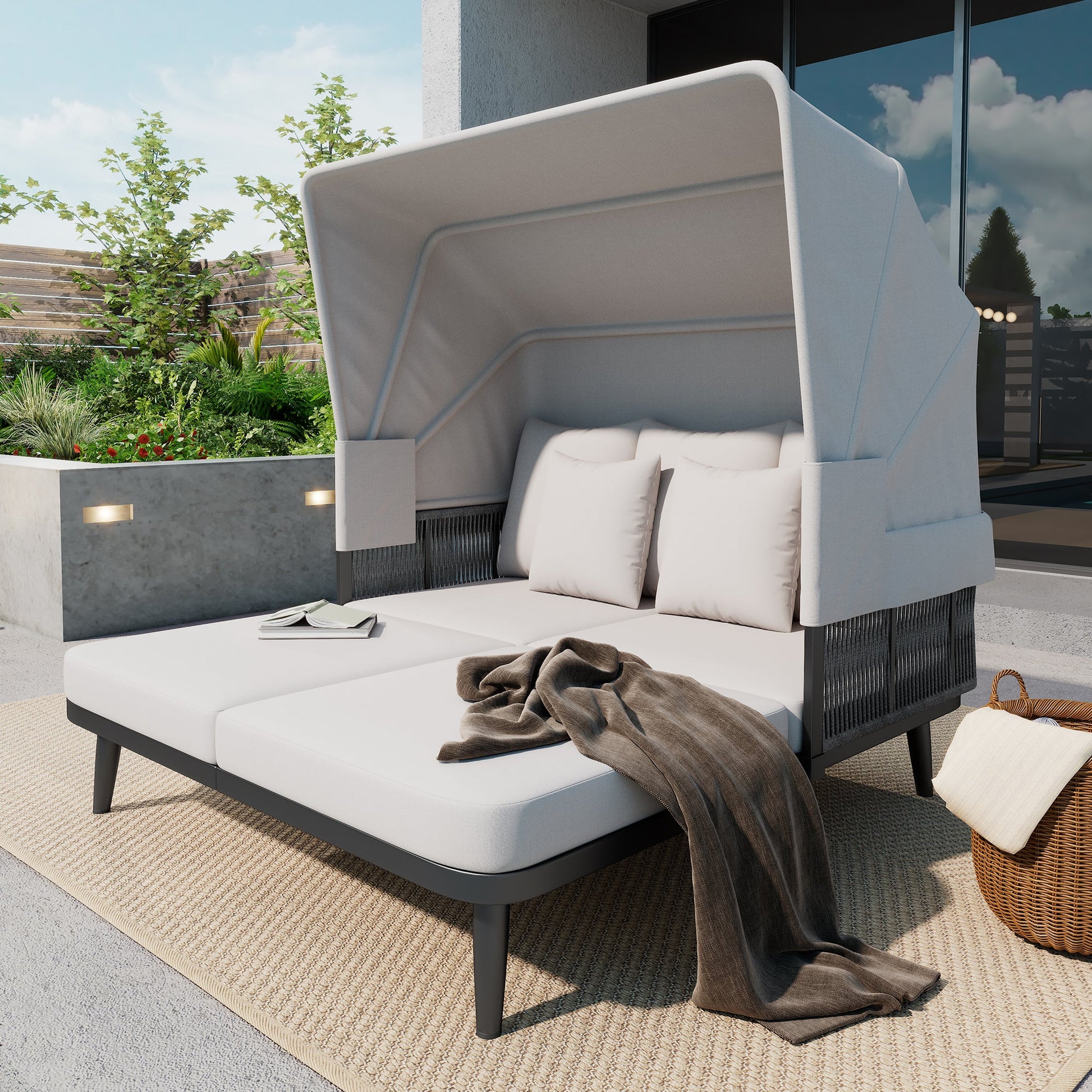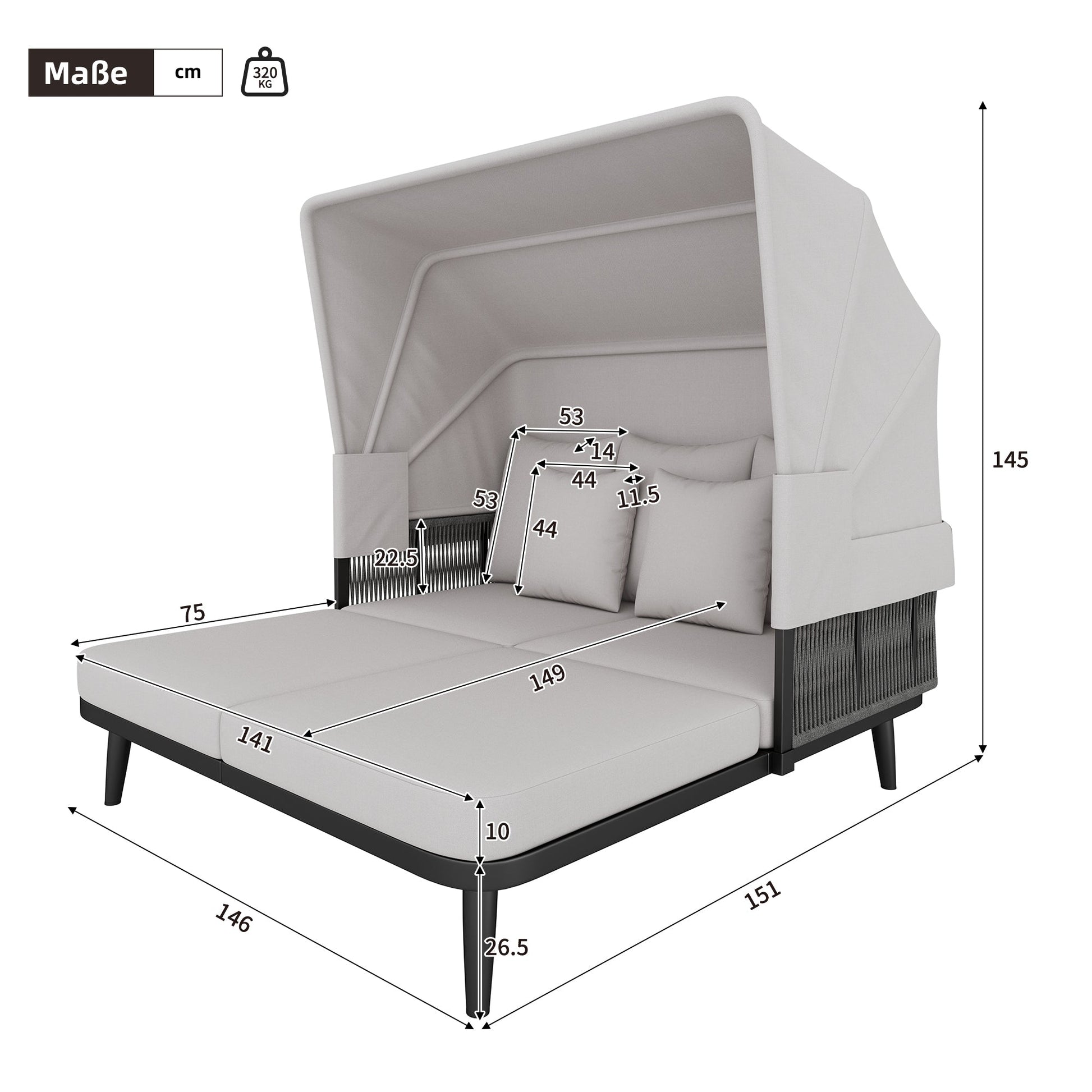 2-Person Garden Sun Lounger with Retractable Awning and Handwoven Rope, Grey