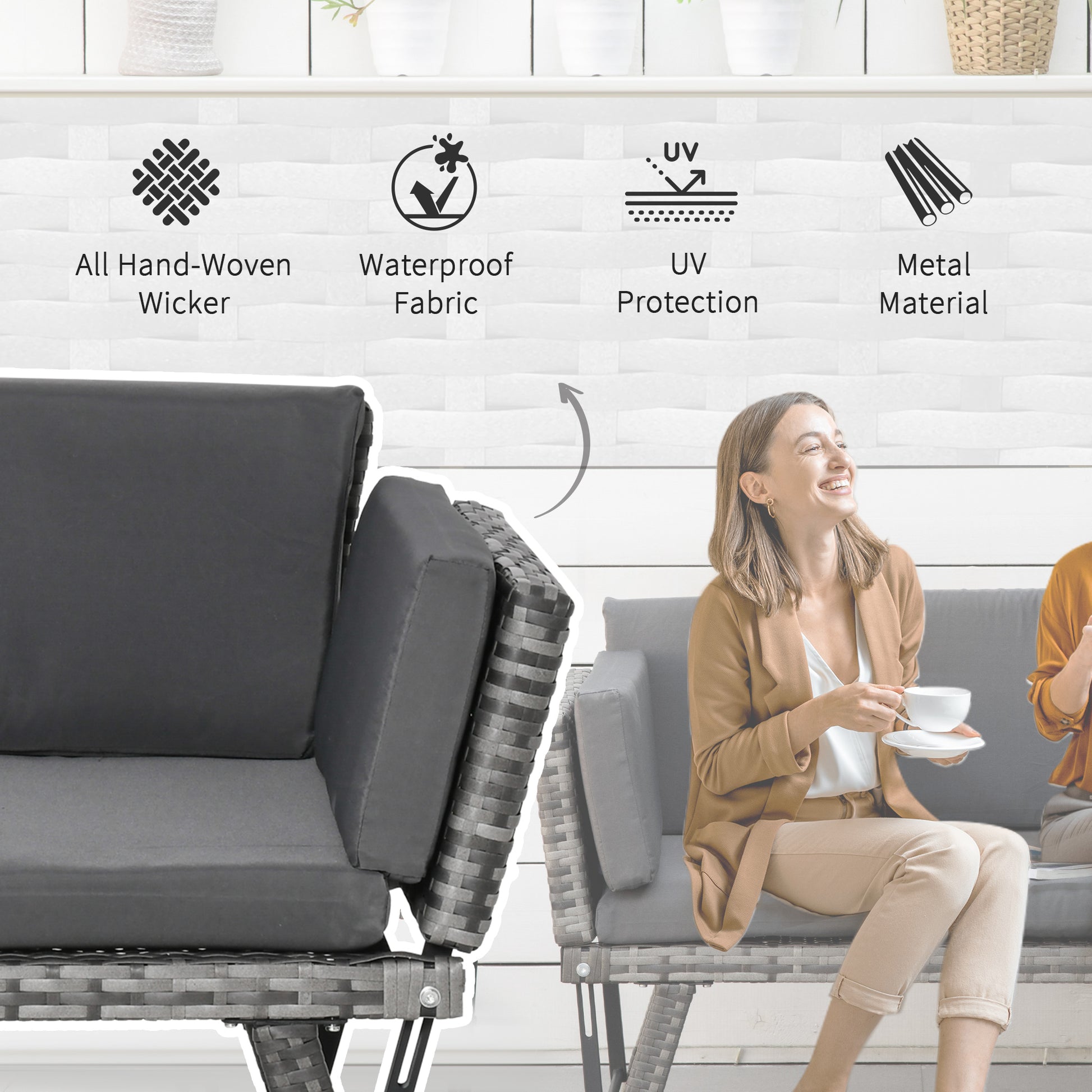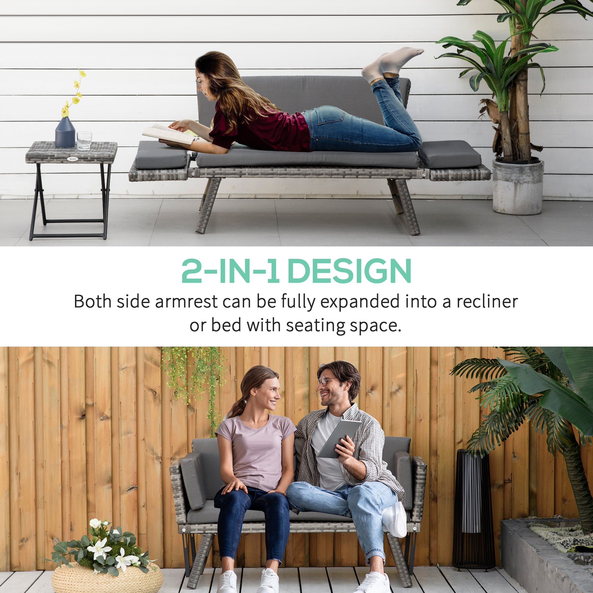 2-in-1 design: This piece transforms between a rattan sofa and a functional reclining bed, with both arms being able to move up and down. This provides greater flexibility for outdoor comfort, allowing you to sit back and lie down completely.