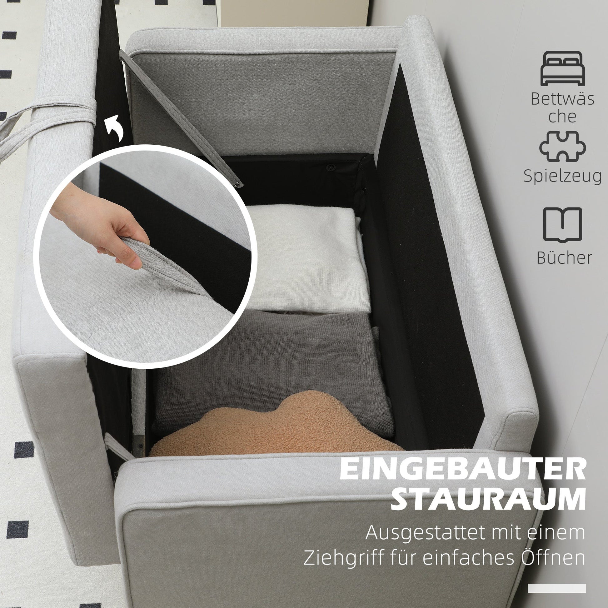 Hidden storage: Equipped with a spacious storage compartment under the seat, easily accessible thanks to a convenient pull handle – perfect for bedding, books, and other belongings.