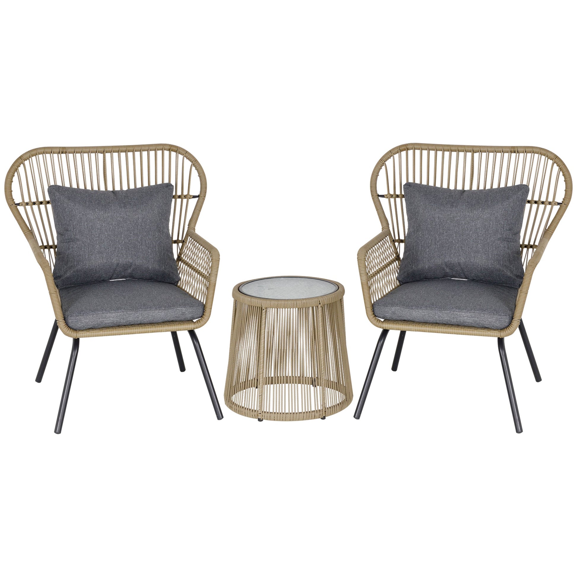 Each piece features a strong and durable steel frame, ensuring you sit comfortably when in use. The frames are wrapped in tough PE wicker. The glass tabletop provides a solid surface to keep everything close to you.