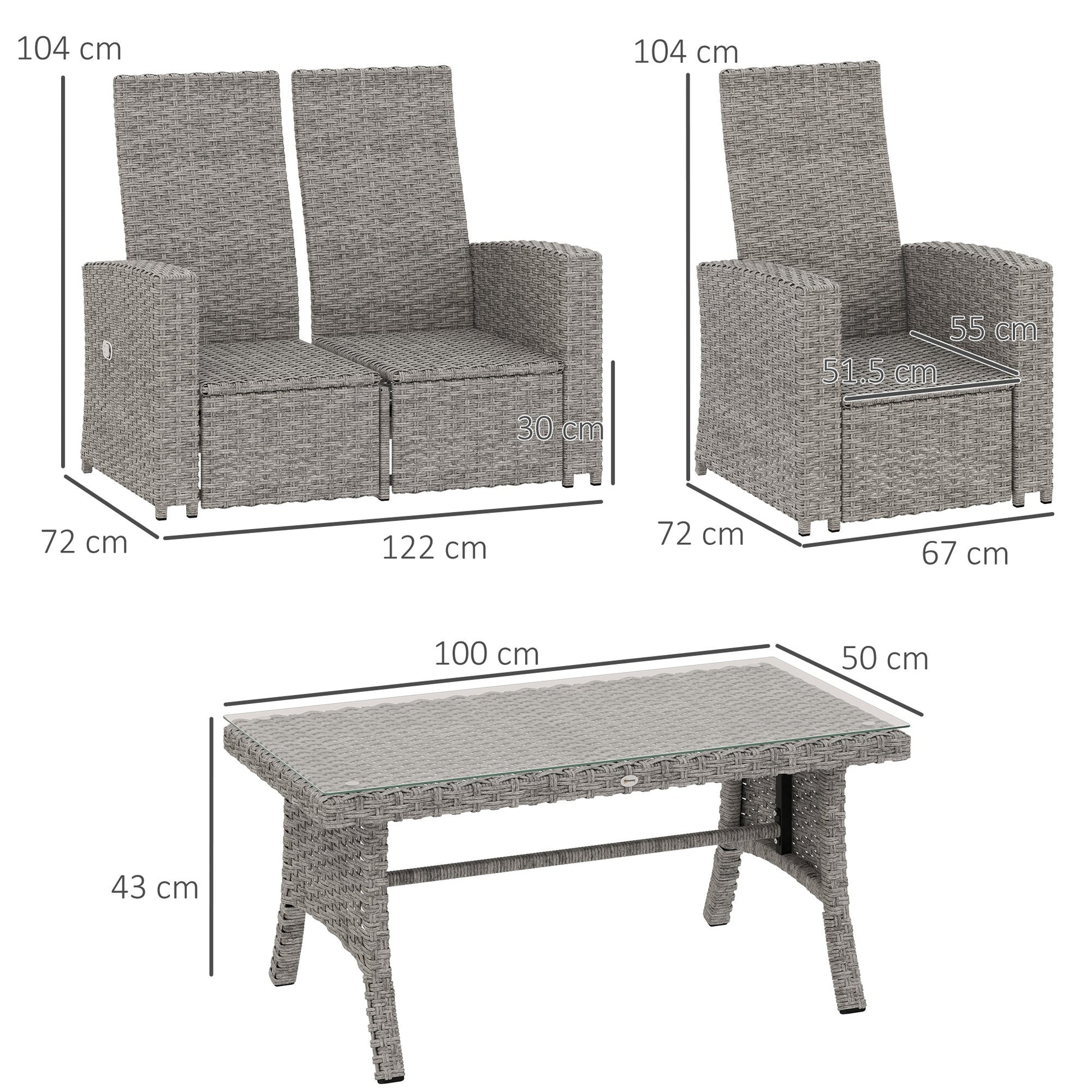 This four-piece rattan garden furniture set includes a loveseat, two armchairs, and a matching coffee table, seating up to four people.