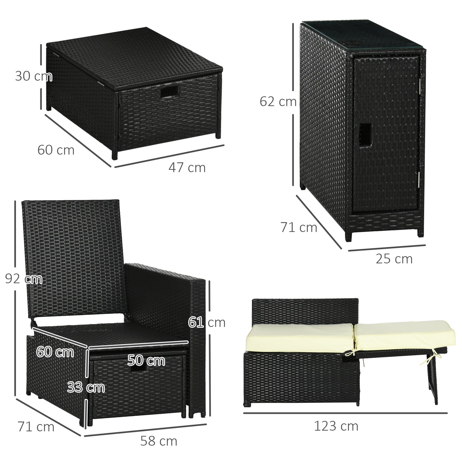 Dimensions: Chair: 93H x 71L x 58Wcm. Stool: 30H x 47W x 60Dcm. Table: 62H x 71L x 25Wcm. Assembly is required.