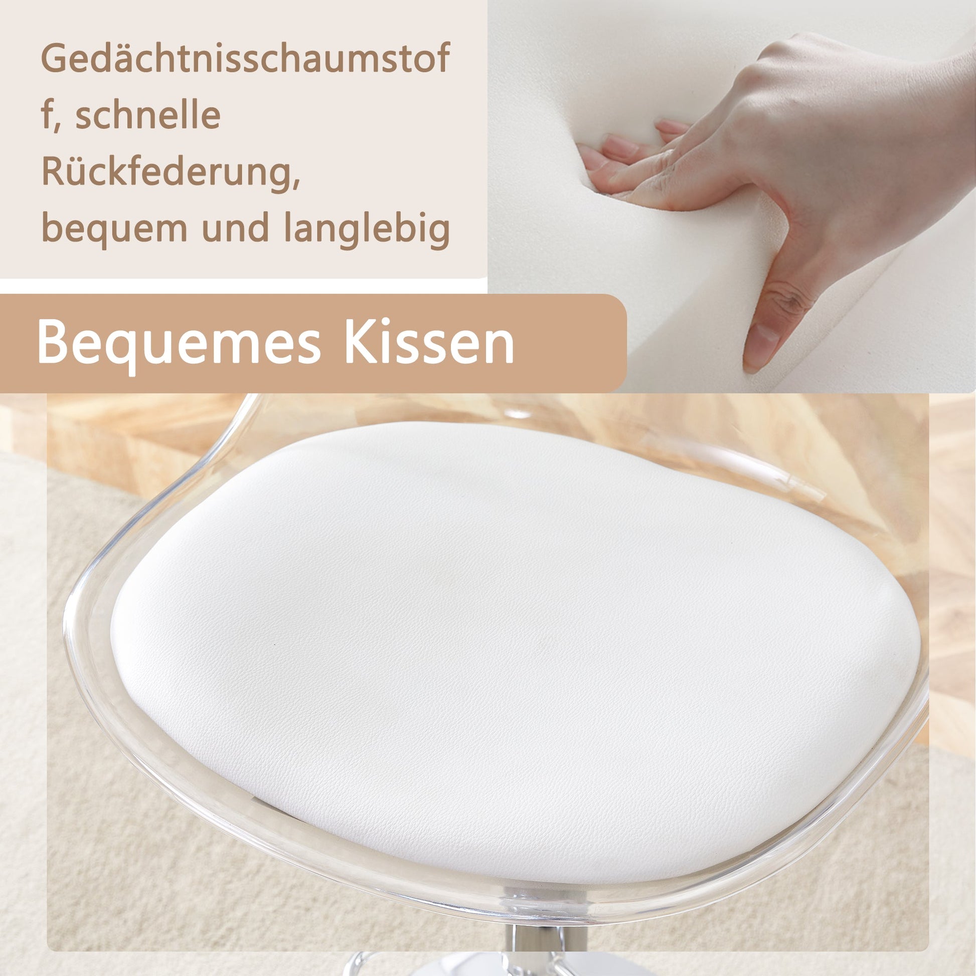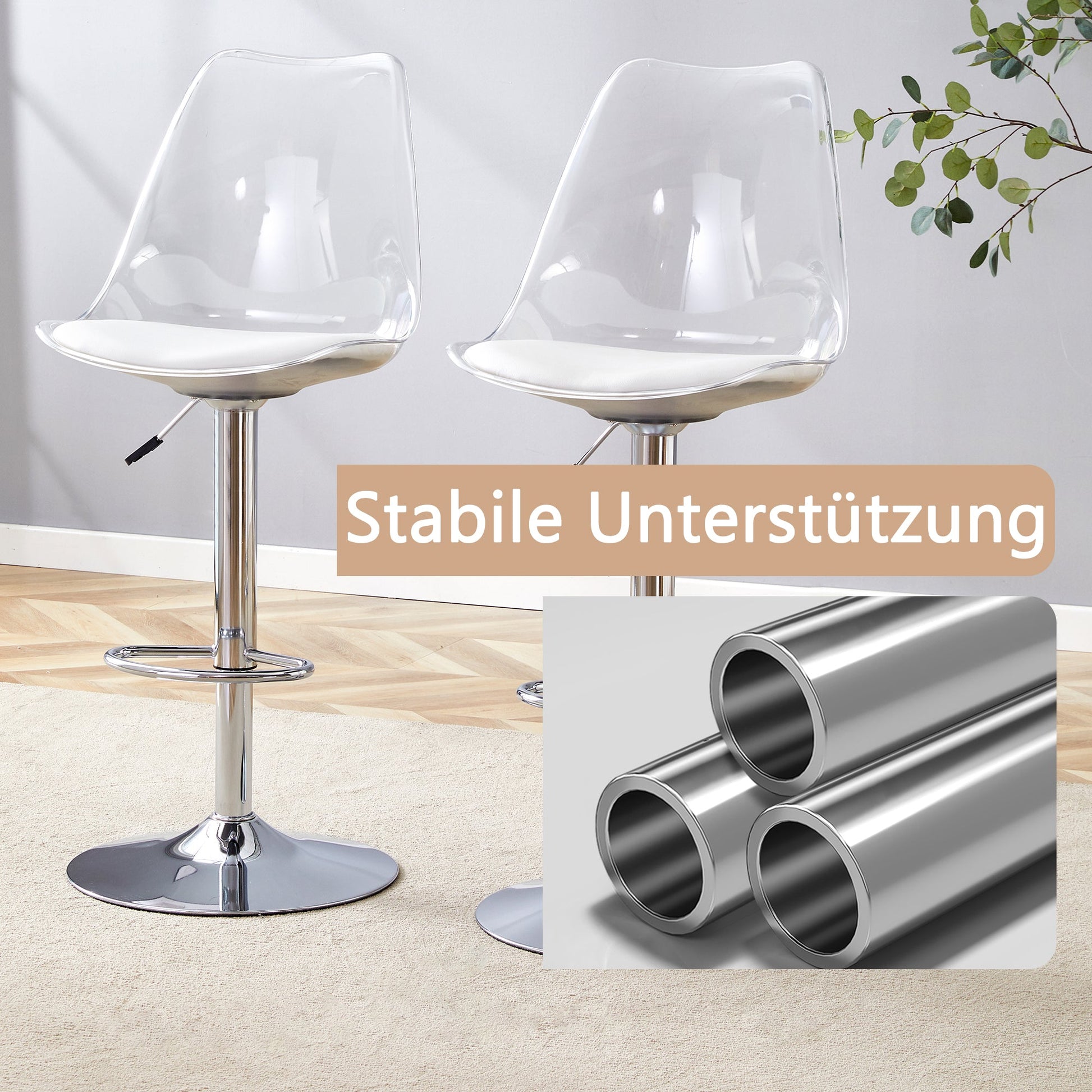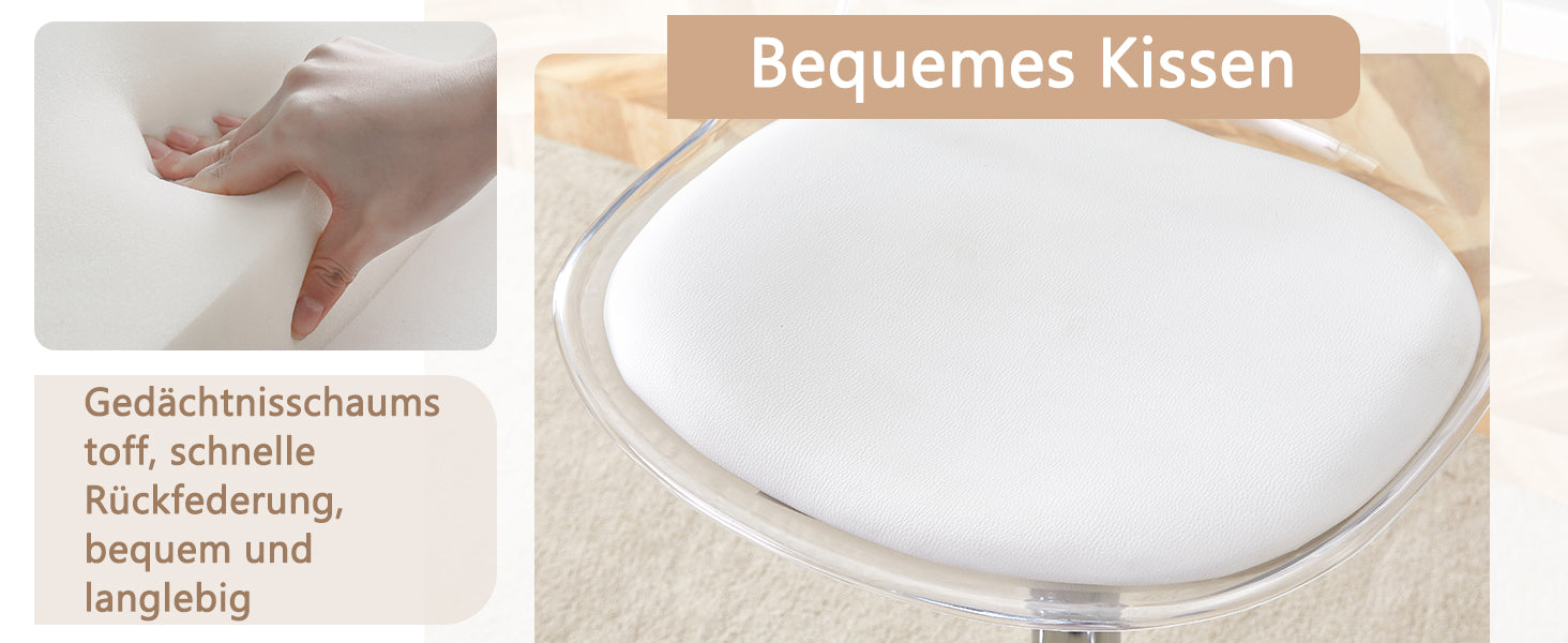 Modern Design and Comfort: This set of two bar stools combines smooth, transparent plastic backrests with soft, supportive PU leather seat cushions, uniting minimalist aesthetics with ergonomic comfort. Ideal for extended periods of sitting in the kitchen, bistro, or home bar.