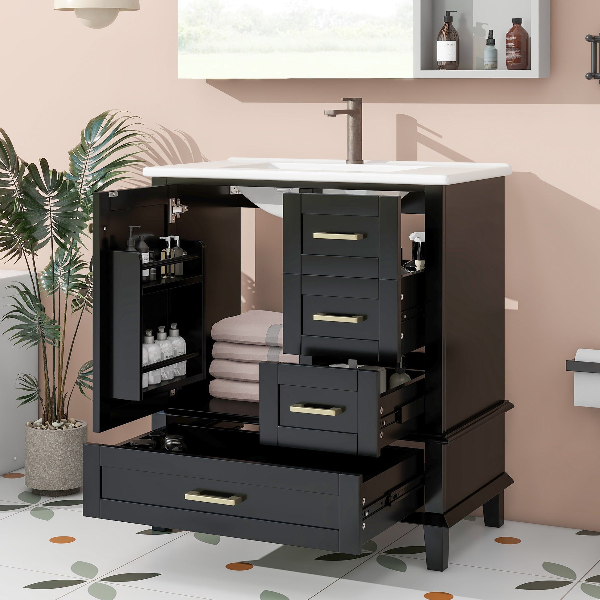 Bathroom Cabinet with Ceramic Sink and Silent Drawers, Black