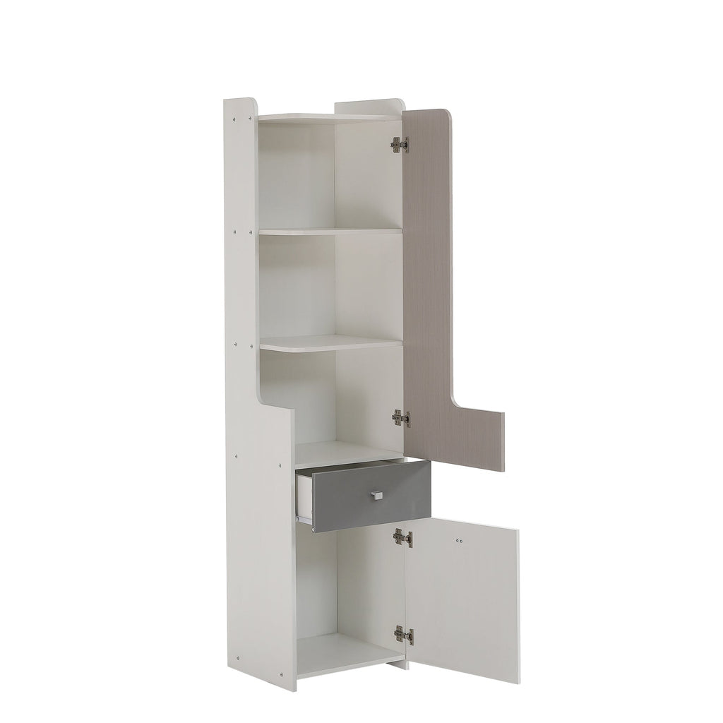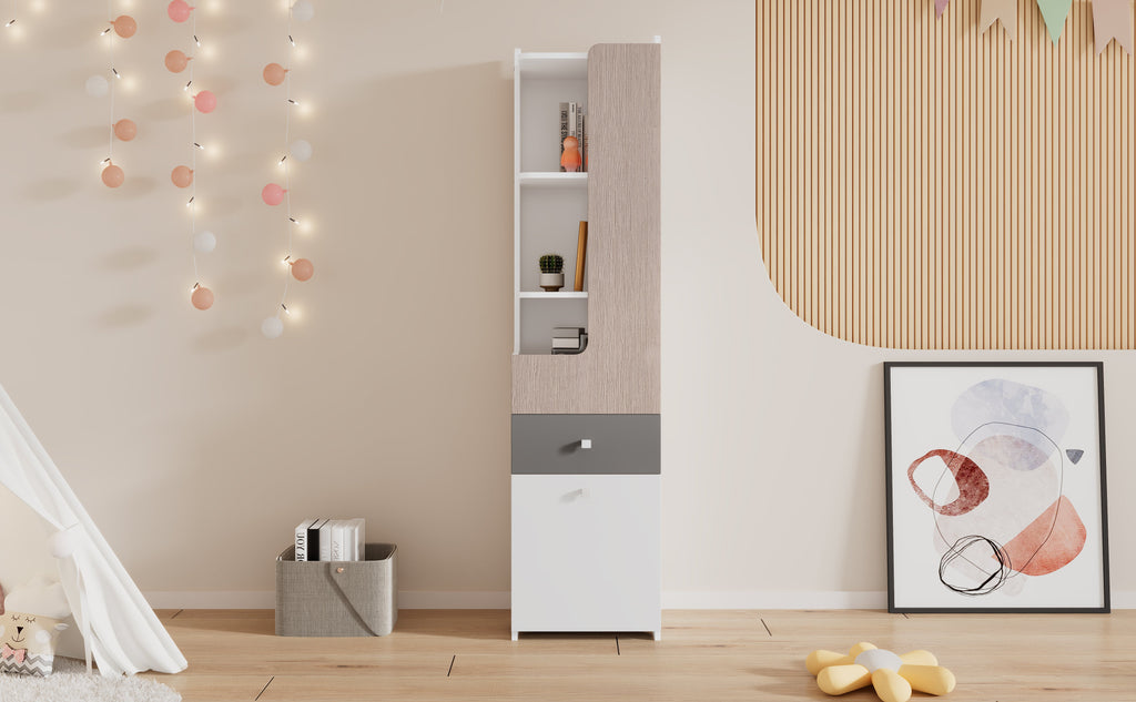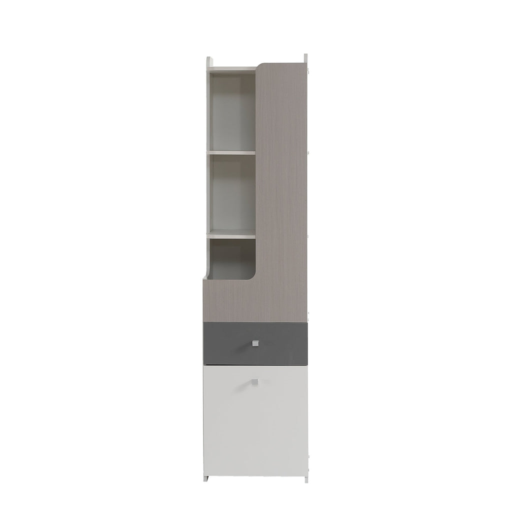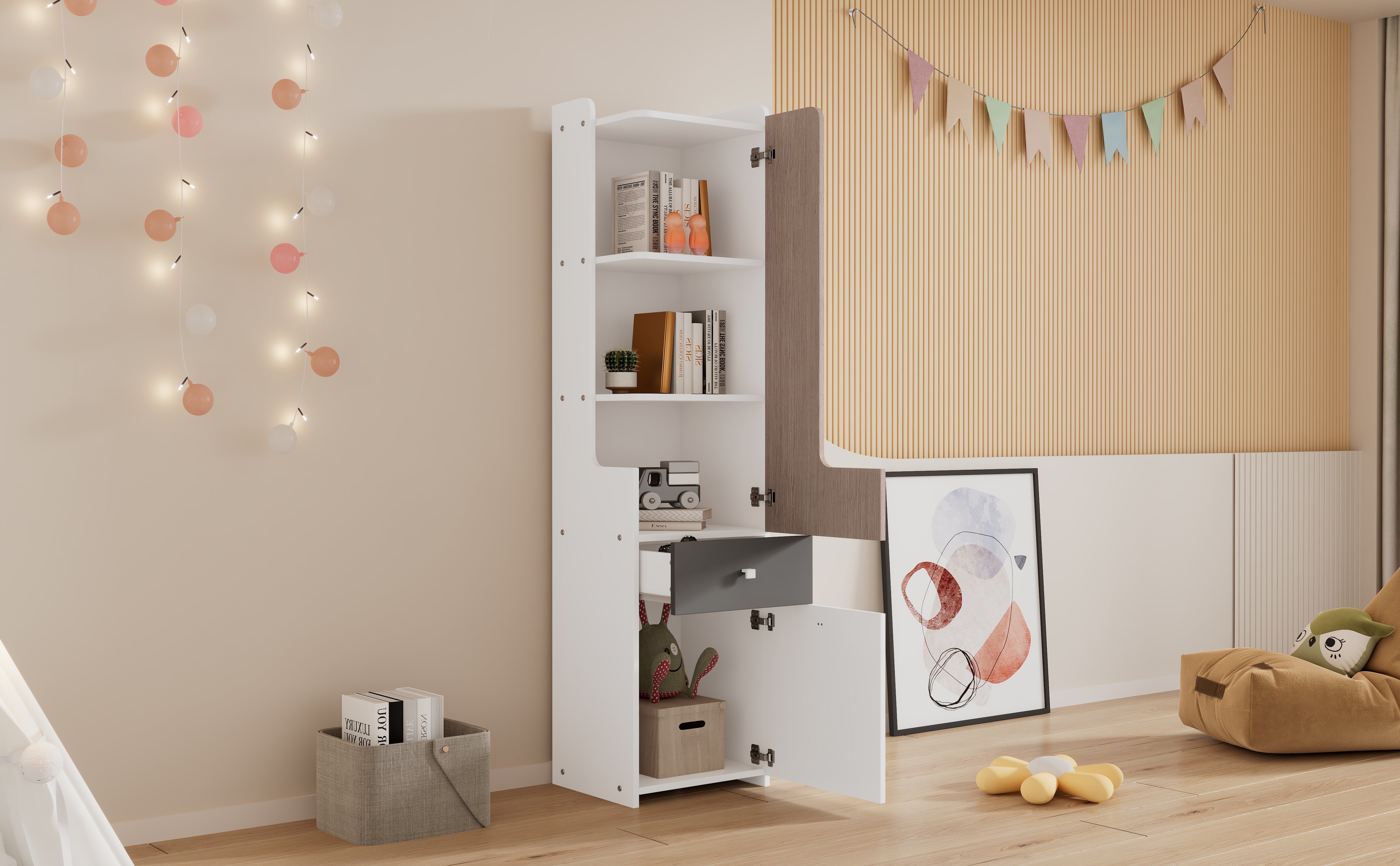 This versatile bookcase is designed specifically for teens. Its L-shaped door, a gray drawer, and two-tone hinged doors add a modern and youthful feel to any room. The silent runners on the drawers ensure smooth opening and closing, and square metal knobs serve as handles, completing the bookcase's design.