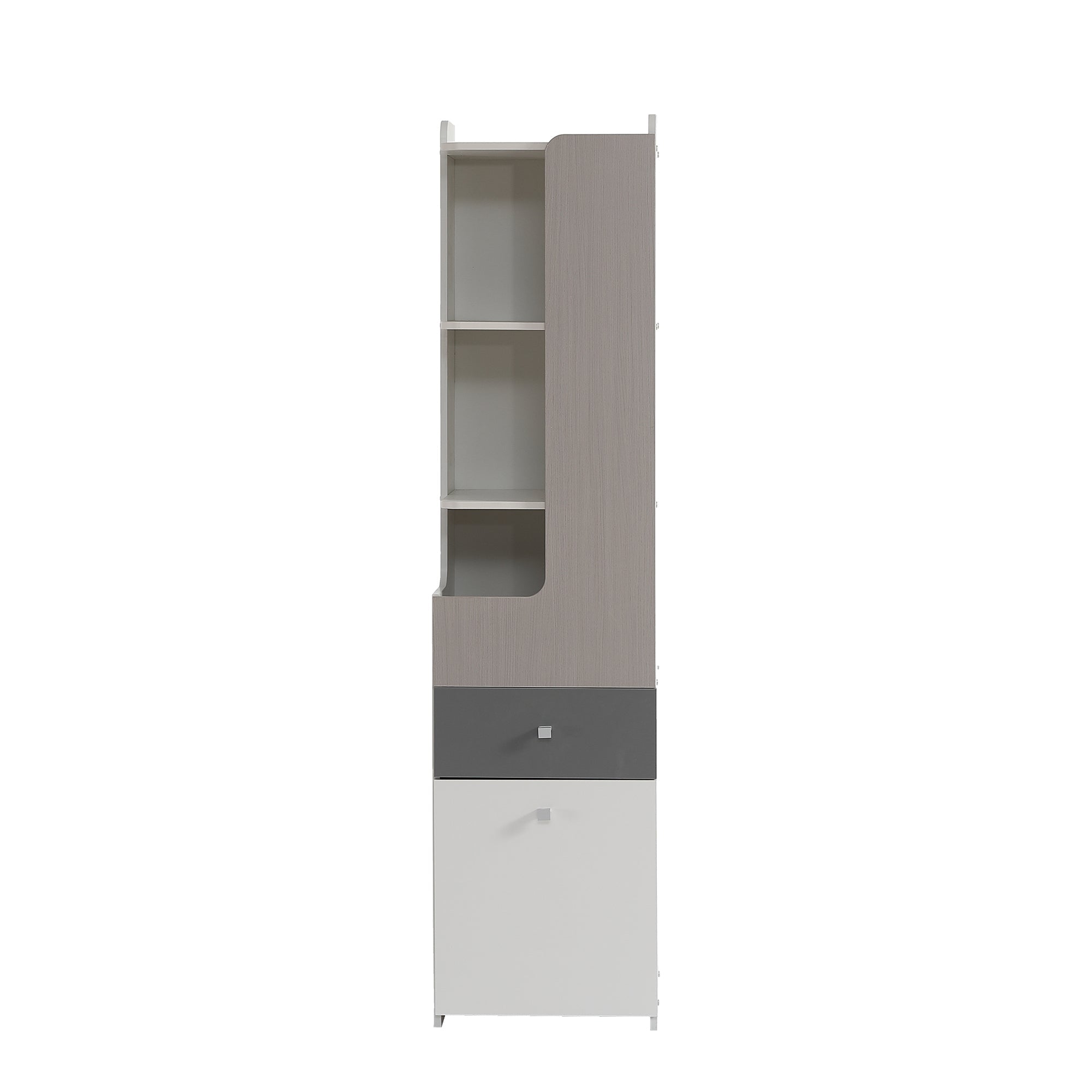 The bookcase offers practical storage space with two shelves, a drawer, and a storage compartment for neatly organizing books, files, and other items. Its tall, vertical design makes it space-saving and ideal for small spaces. Made of white MDF with light elm and gray accents, this bookcase blends seamlessly into a variety of interior styles.