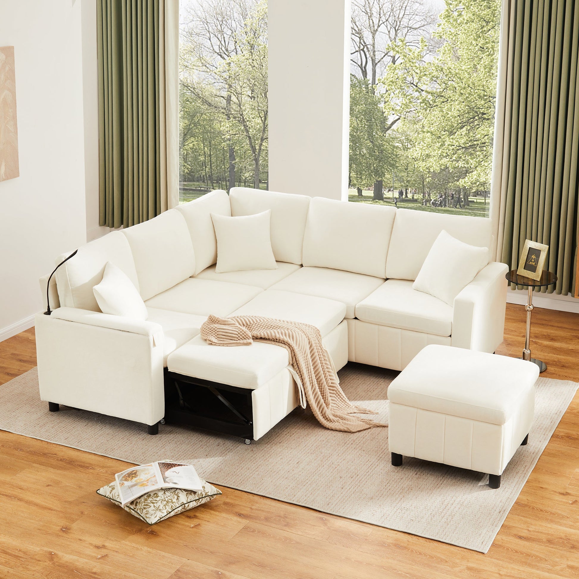 Chenille Corner Sofa Bed with Ottoman and USB Charging, Beige